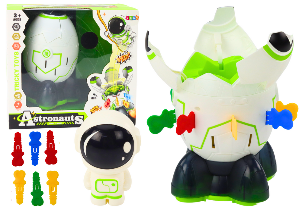 Šis arkadinis šokčiojančio kosmonauto žaidimas – tai juoko, netikėtumo ir smagios įtampos kupinas žaislas, tinkantis visai šeimai. Žaidimo principas paprastas, bet nepaprastai linksmas: įstatyk kosmonautą į raketą, o tada paeiliui stumkite lazdeles aplink ją. Vienas iš ėjimų taps lemtingu – kosmonautas staiga iššoks į orą, sukeldamas juoko bangas.