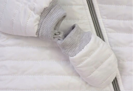 Kirpimas : kombinezonas, įstrižai užsegamas užtrauktuku, ties kaklu sutvirtintas medžiaga, kad nedirgintų vaiko odos, rankogaliai ir nuimamos pirštinės rankovėse.