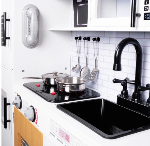 ⭐ Įranga : Virtuvėje yra kriauklė, orkaitė ir viryklė, todėl vaikai gali imituoti visą maisto gaminimo procesą.