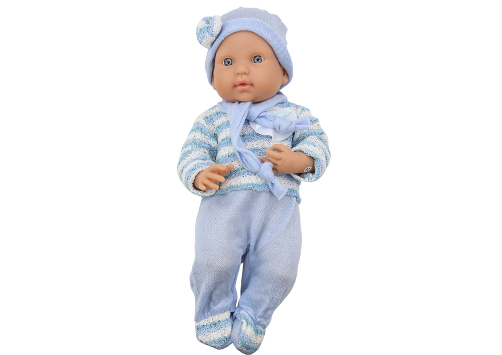 Ši mieloji kūdikio lėlė su mėlyna apranga yra puikus pasirinkimas mažiesiems globėjams, mėgstantiems rūpintis, myluoti ir kurti švelnius žaidimo scenarijus. Lėlė vilki mielą megztuką su mėlynais ir baltais dryžiais, turi kepurę ir švelnų mėlyną šaliką, todėl atrodo jaukiai ir stilingai – tarsi tikras mažylis.
