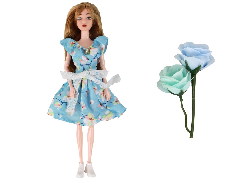 Lėlė vilki mėlyną gėlėtą suknelę, dekoruotą nėriniuotu kaspinu ir mažyčiu deimantiniu akcentu prie kaklo. Tai elegantiškas, švelnus ir pavasariškas įvaizdis, kurį papildo balti bateliai.