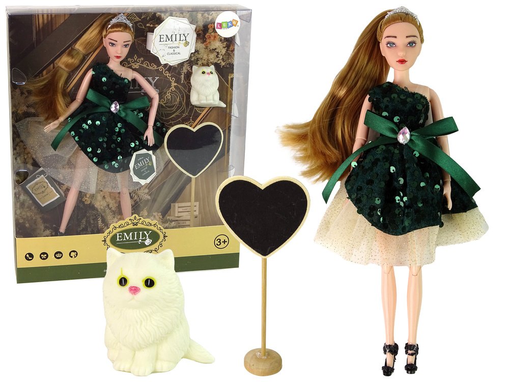 Susipažinkite su žavingąja Emilija – elegantiška lėle ilgais šviesiais plaukais, surištais į dailią uodegą ir papuoštais spindinčia tiara. Jos žalios akys ir subtili veido išraiška suteikia žaislui šilumos ir išskirtinumo. Emilija vilki prabangią butano žalumo suknelę, dekoruotą žaliais blizgučiais ir kaspinu, o ant kojų avisi juodus batelius su rože.