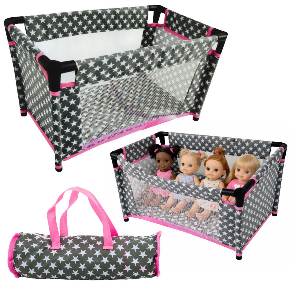 Pilka–rožinė lėlių lovytė su žvaigždutėmis – sulankstoma, su tinklinėmis sienelėmis, patalyne ir nešiojimo krepšiu (3+)