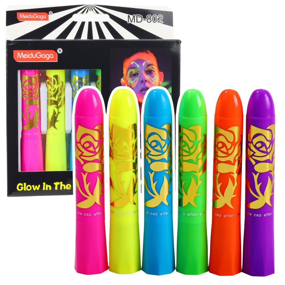 Neoninių veido dažų rinkinys vaikams – 6 fluorescenciniai markeriai, saugi formulė, šviečia UV šviesoje (3+)