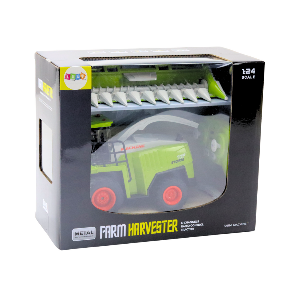 Nuotoliniu būdu valdomas kombainas su kukurūzų pjaunamąja – realistiškas 1:24 modelis su šviesomis, garsais ir 2.4G valdymu (3+)