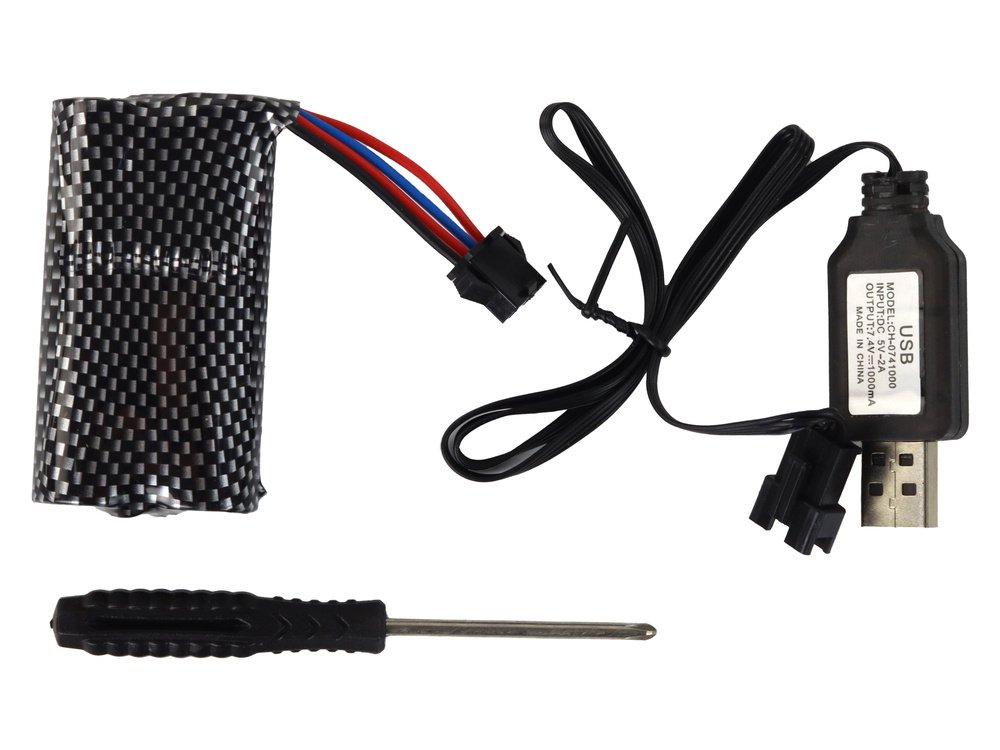 Šautuvas maitinamas 7.4V baterija, kuri yra komplekte kartu su originaliu įkrovikliu.
