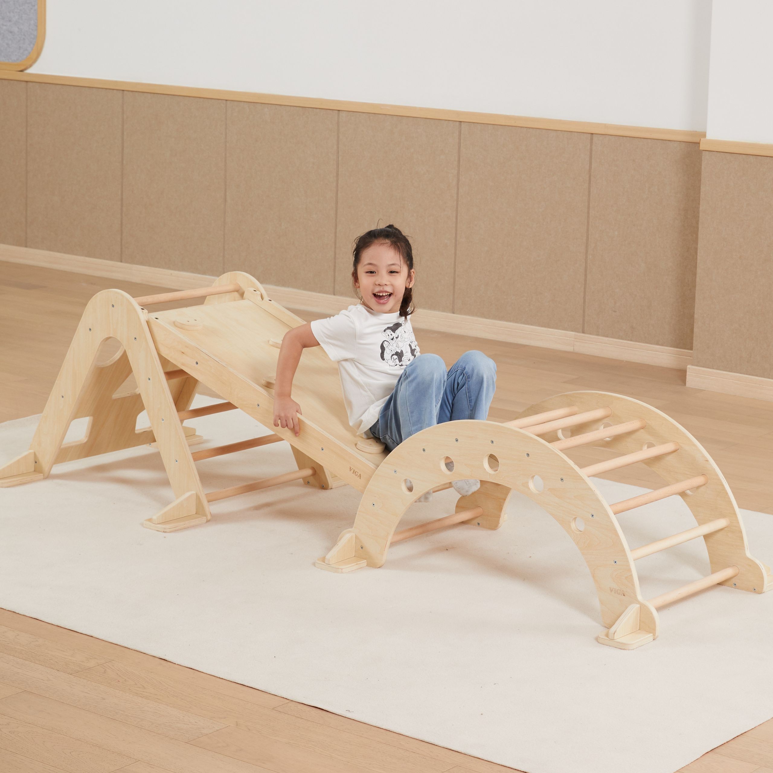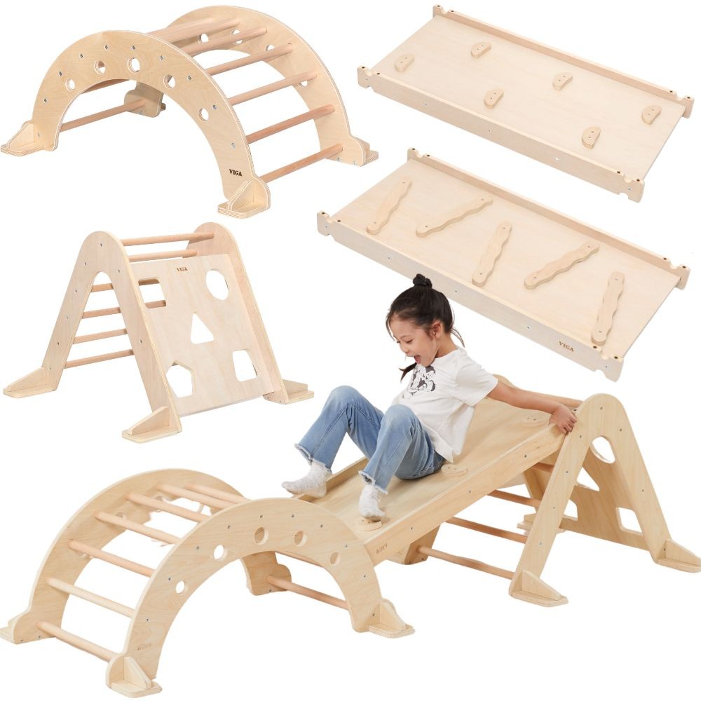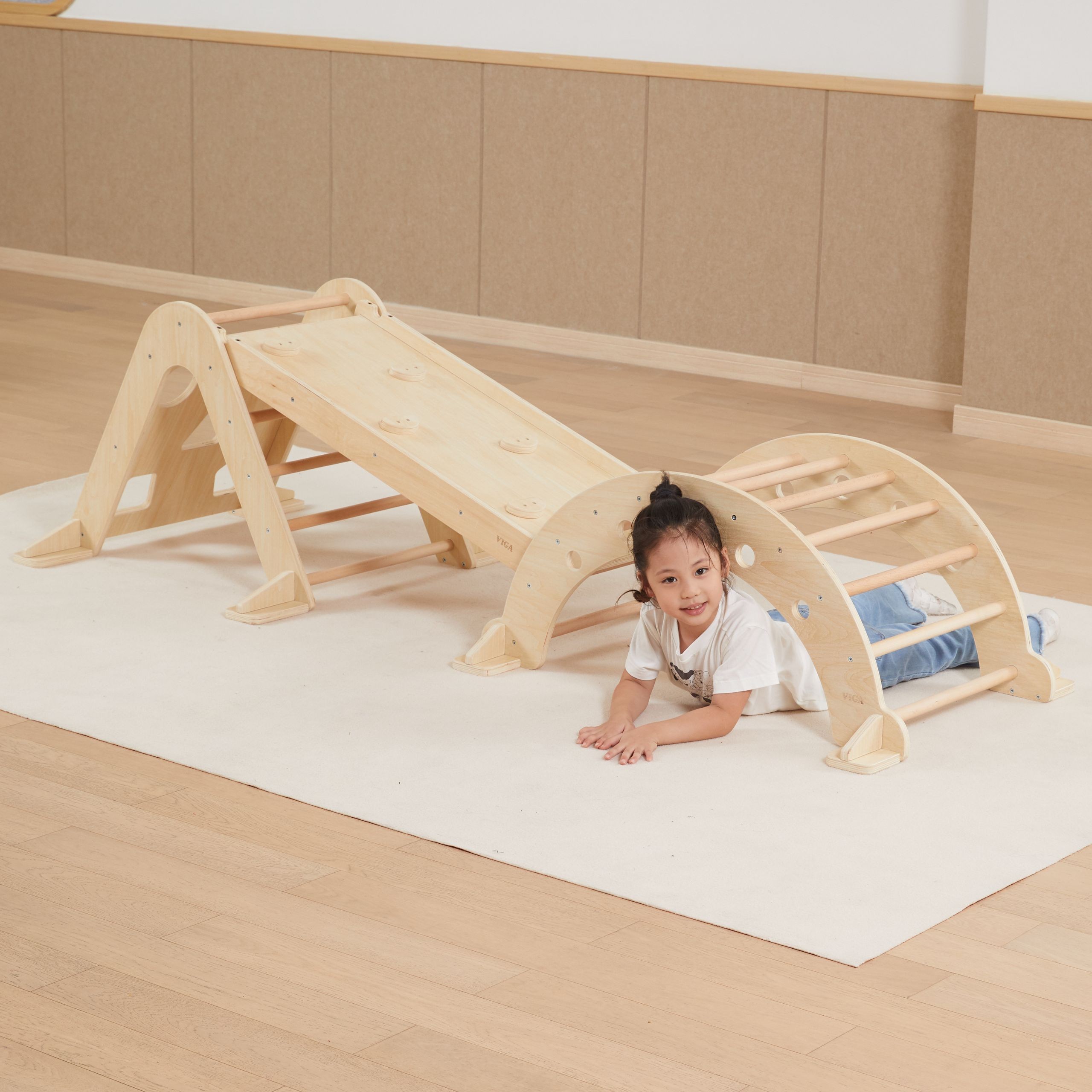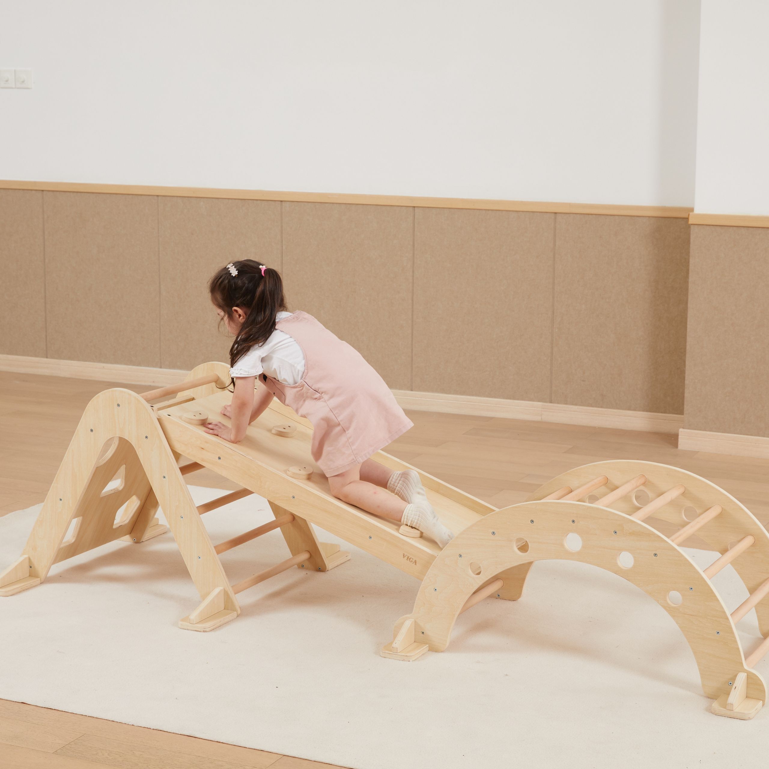 VIGA pilnas „Gymnastics Set“ yra Montessori principu paremtas namų aktyvaus judėjimo rinkinys, skirtas vaikams nuo 18 mėnesių. Jį sudaro laipiojimo trikampis, daugiafunkcė rampa ir supynė, leidžiantys sukurti nuolat kintantį namų kliūčių ruožą, kuris auga kartu su vaiku.