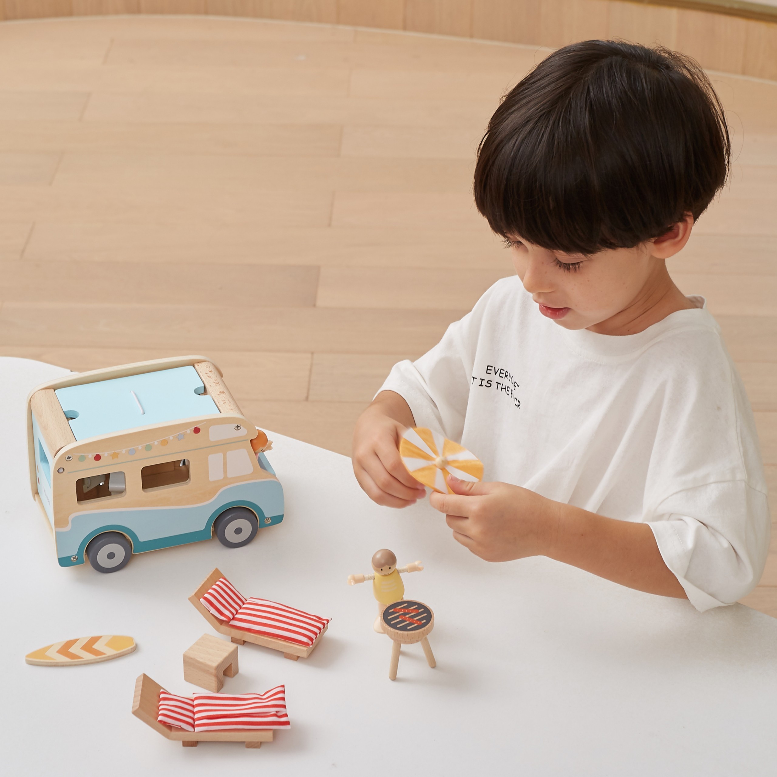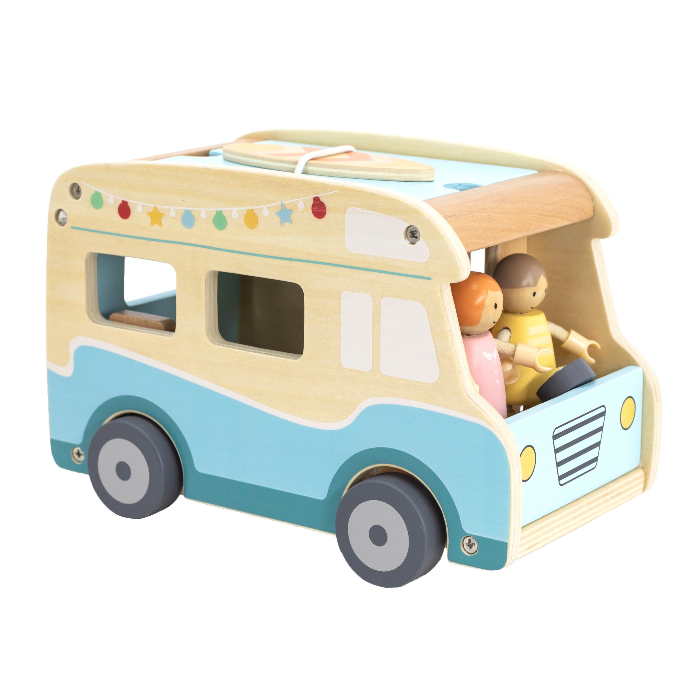 Leiskimės į kelionę su šiuo „Viga“ paplūdimio kemperiu! Rinkinyje yra 2 figūrėlės, 2 gultai su minkštomis pagalvėlėmis, stalas, grilis, paplūdimio skėtis, banglentė, tualetas ir šuo. Kemperis turi slankiojančias duris, atidaromą stogą, banglentės laikiklį ir lengvai atidaromą bagažinę.