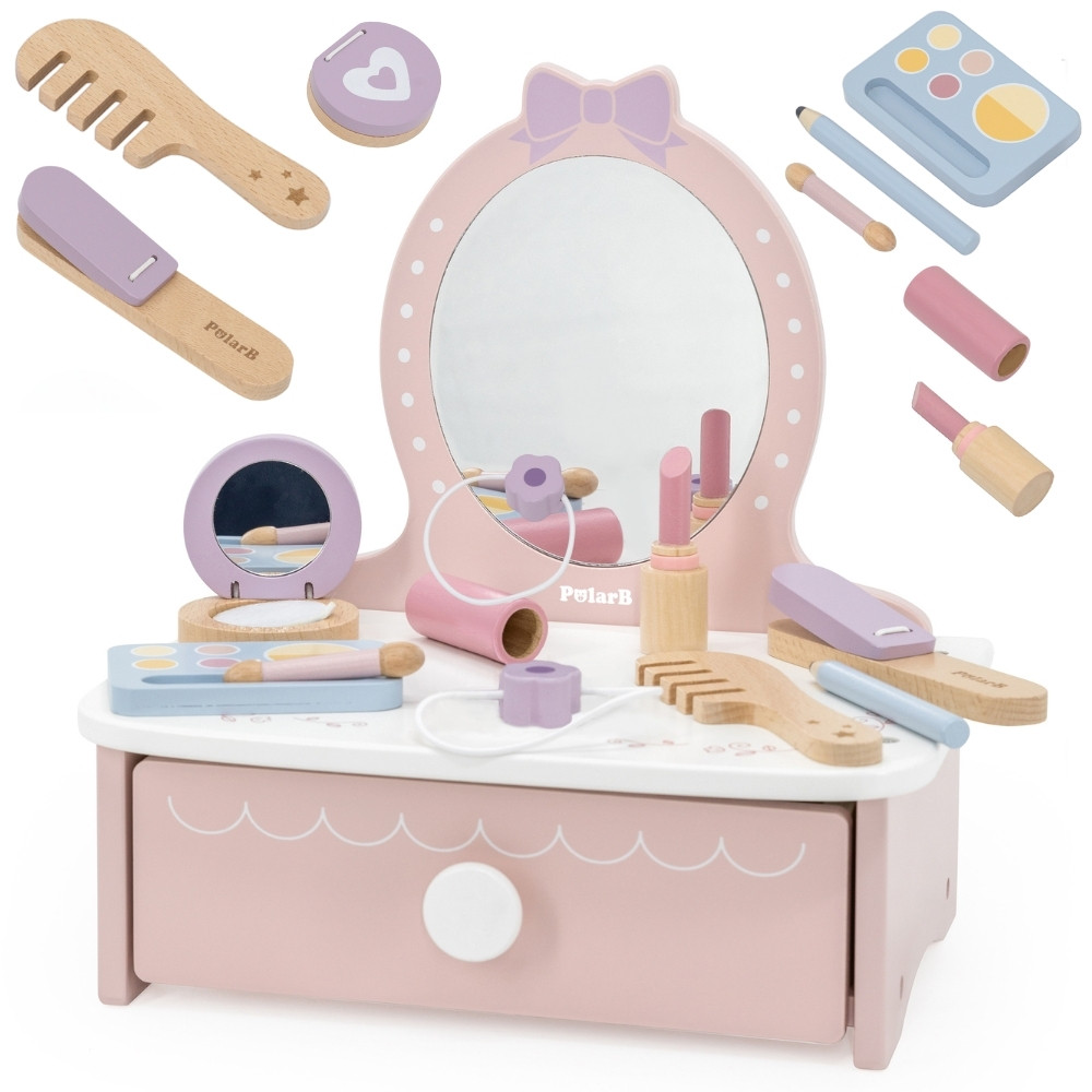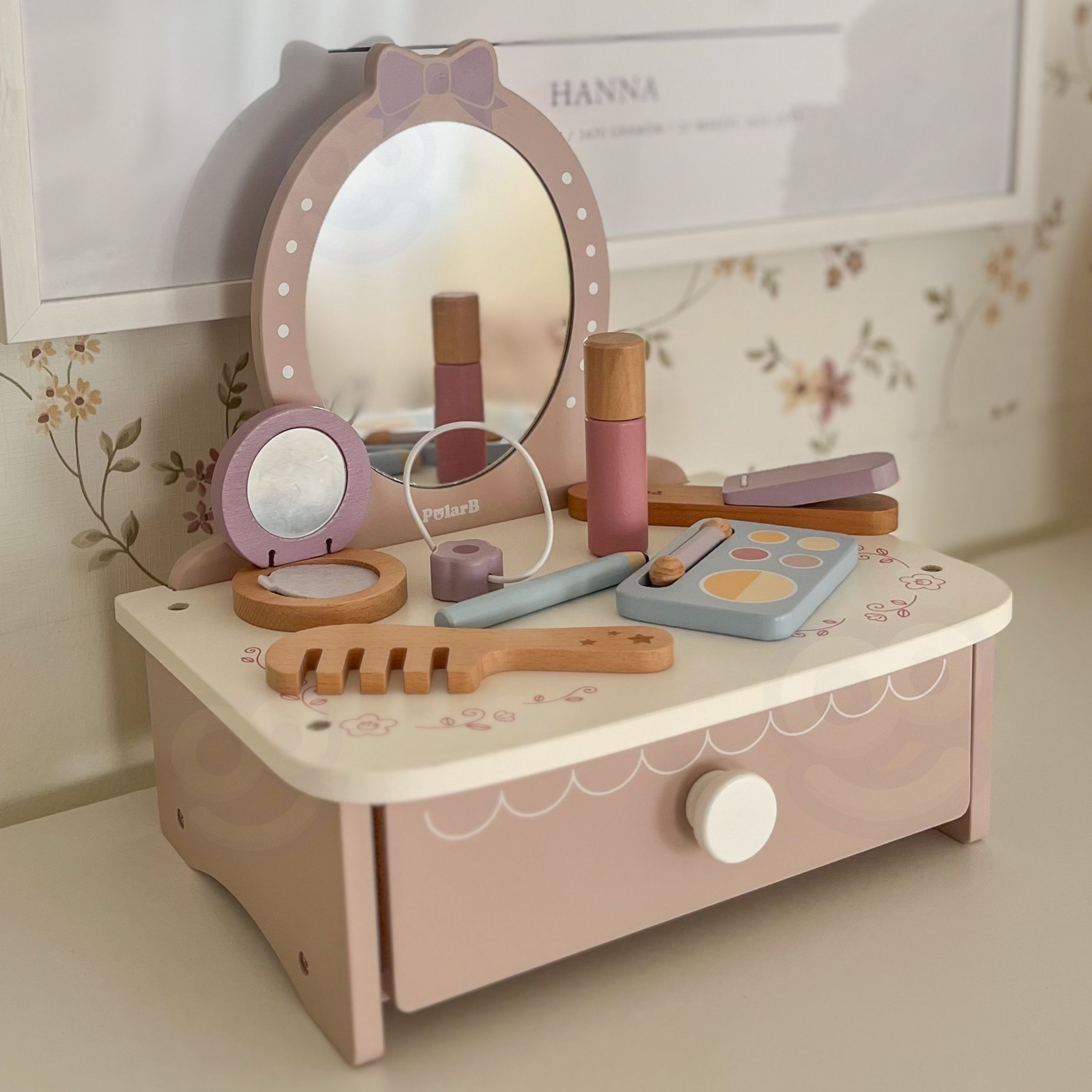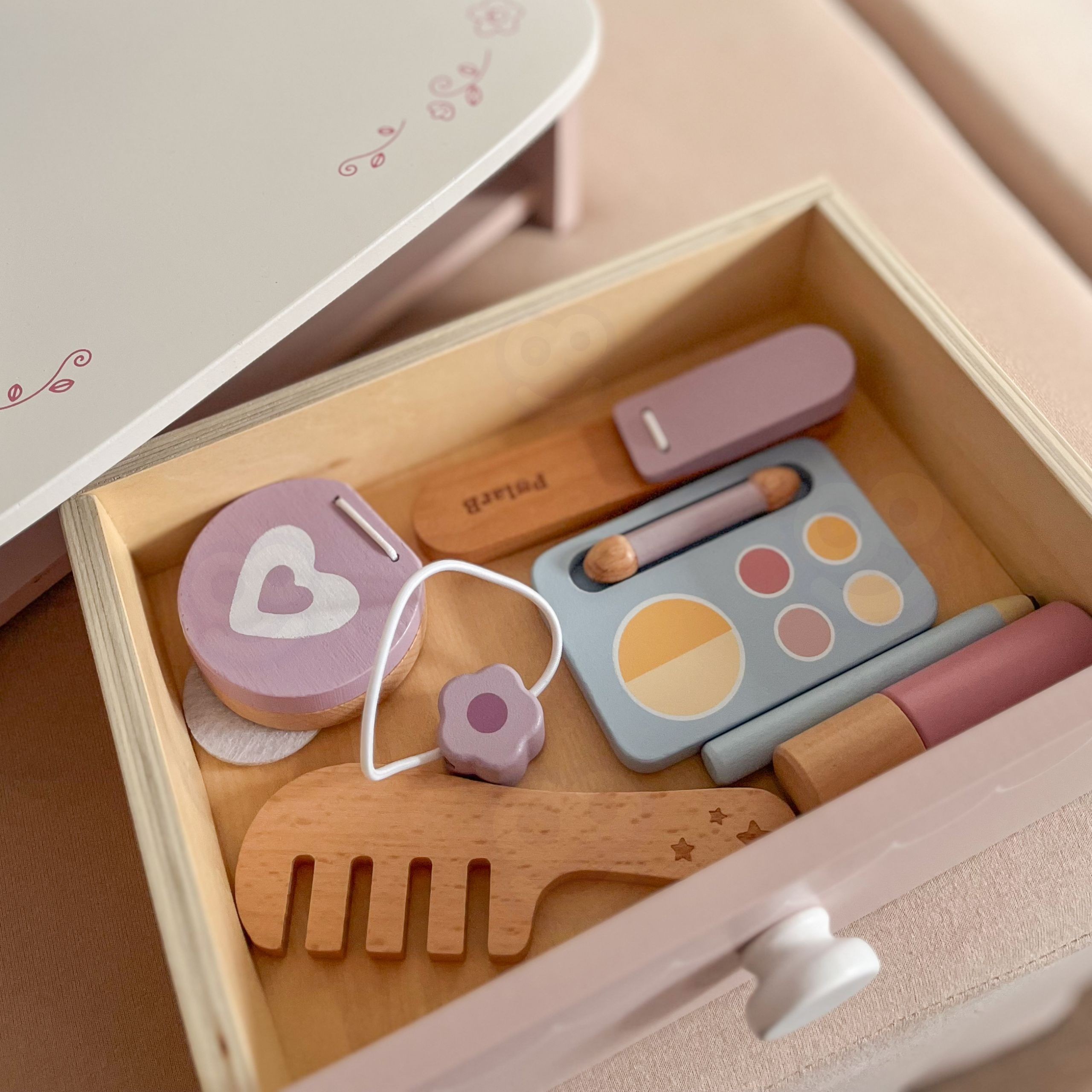 Šis nuostabus Viga medinis tualetinis staliukas – tai idealus žaidimų rinkinys kiekvienai mergaitei, mėgstančiai puoštis, žaisti „namus“ ar grožio saloną. Pastelinės spalvos, saugus veidrodis ir gausybė žavių aksesuarų suteiks vaikui daug džiaugsmo ir ilgas valandas kūrybiško žaidimo. Šis žavingas medinis staliukas – ne tik žaislas, bet ir vartai į fantazijos bei vaidmenų žaidimų pasaulį.