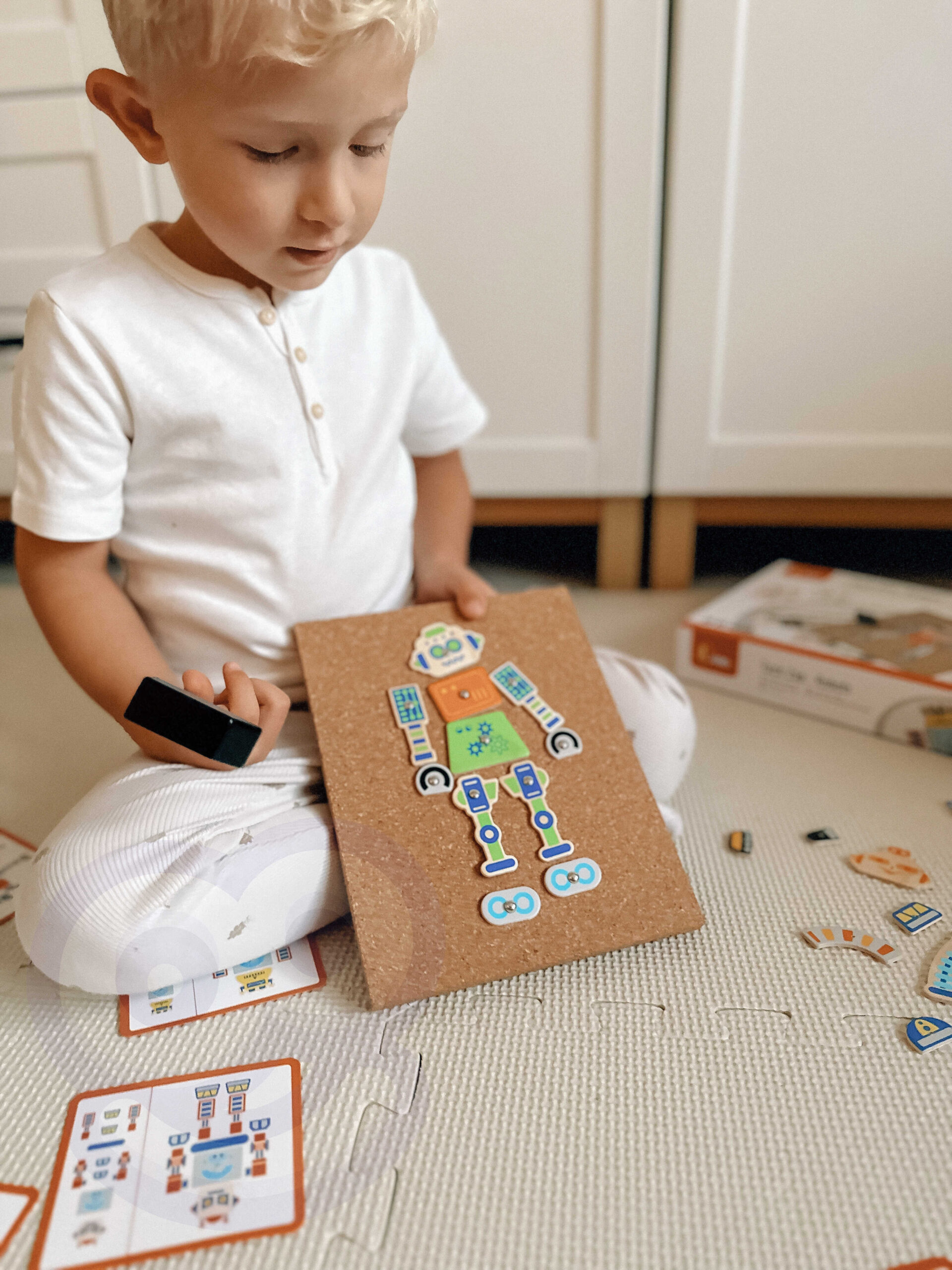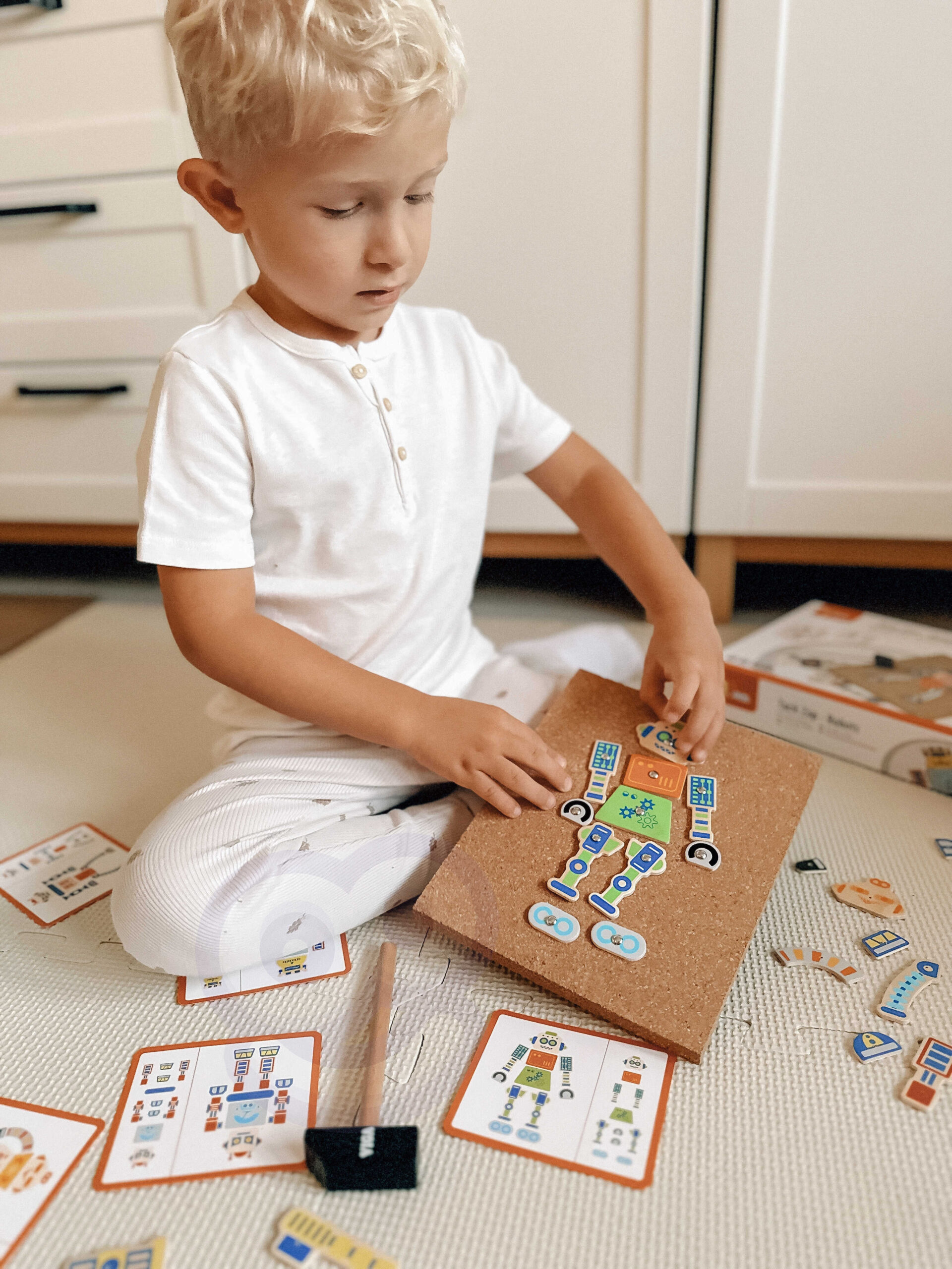 Dėl pridedamų pavyzdžių kortelių vaikas gali atkartoti pateiktus modelius arba leisti vaizduotei kurti savo ateities robotus.