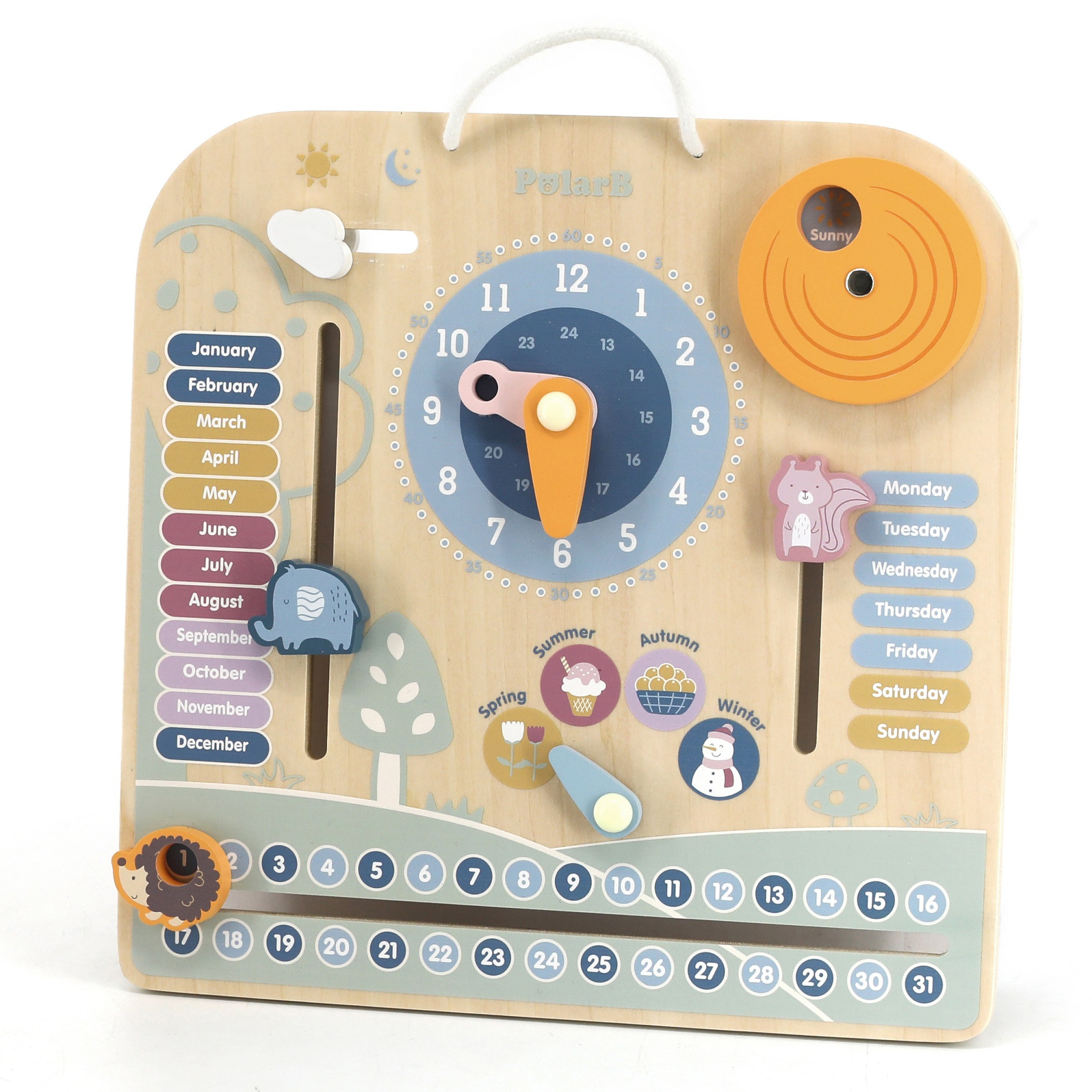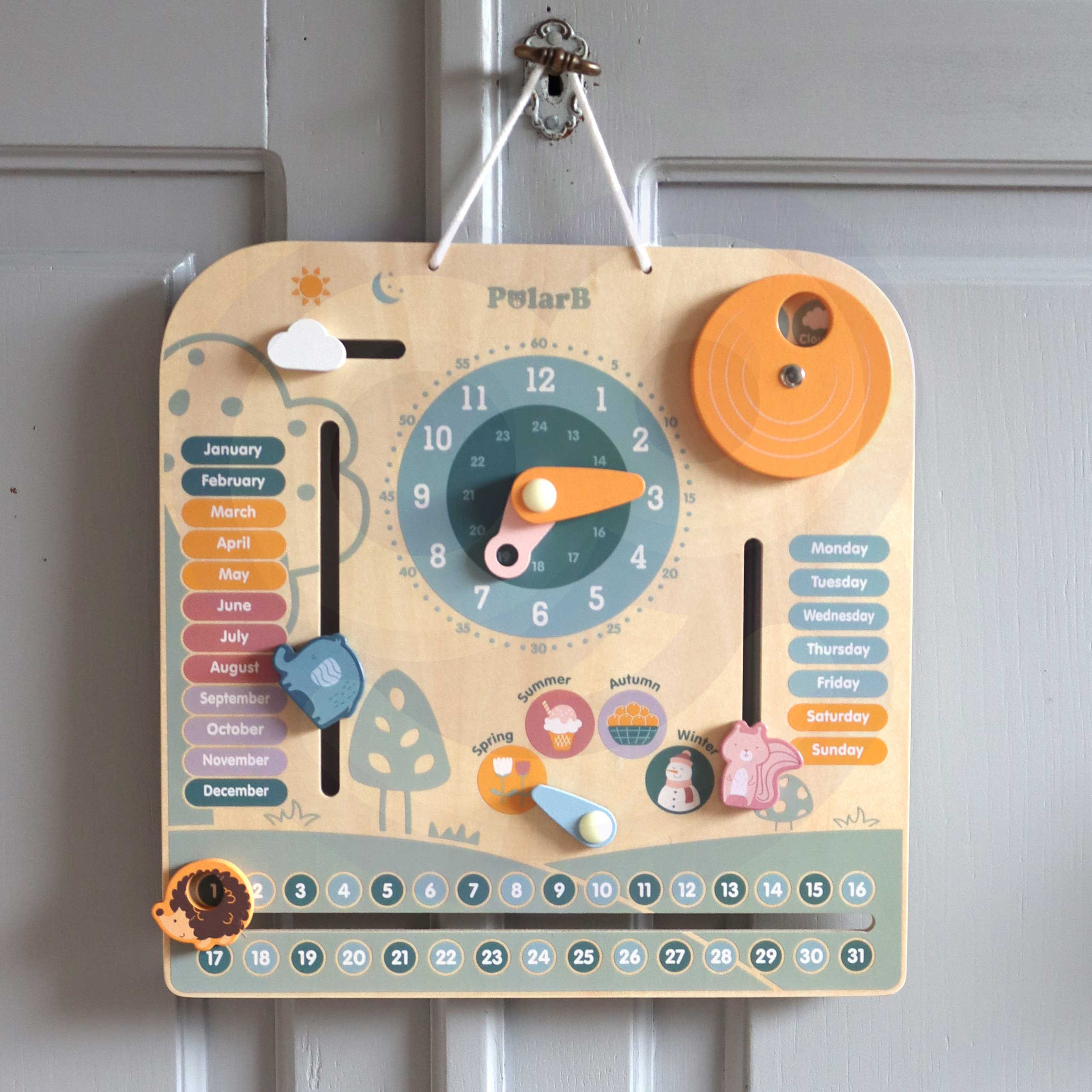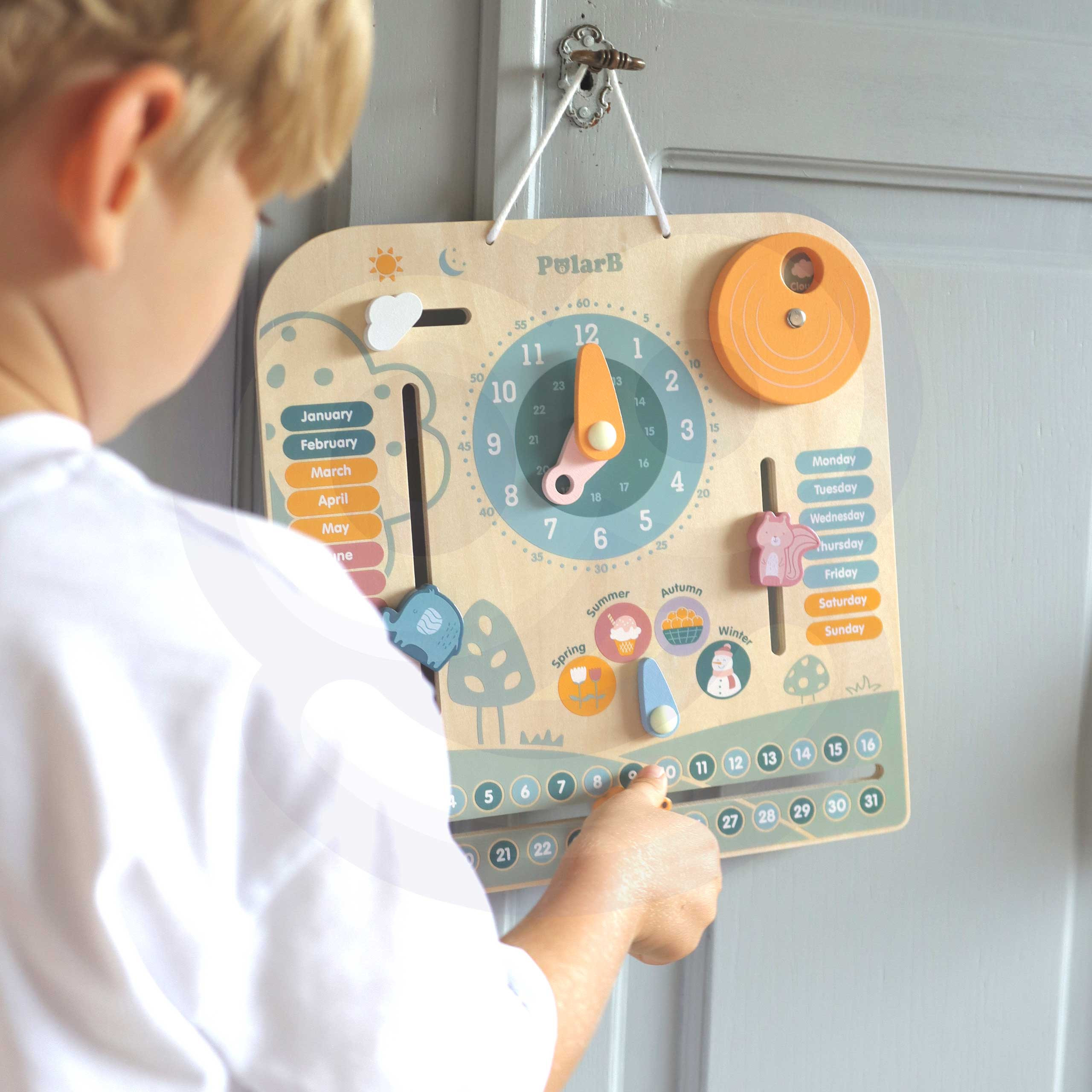 VIGA PolarB medinis kalendorius ir laikrodis yra puikus žaislas, jungiantis žaidimą ir mokymąsi. Jis padeda vaikui išmokti naudotis laikrodžiu bei lavinti laiko suvokimą. Dėl spalvingų paveikslėlių ir figūrėlių galima mokyti savaitės dienų, mėnesių ir metų laikų pavadinimų anglų kalba. Tai idealus būdas derinti žaidimą su mokymusi.