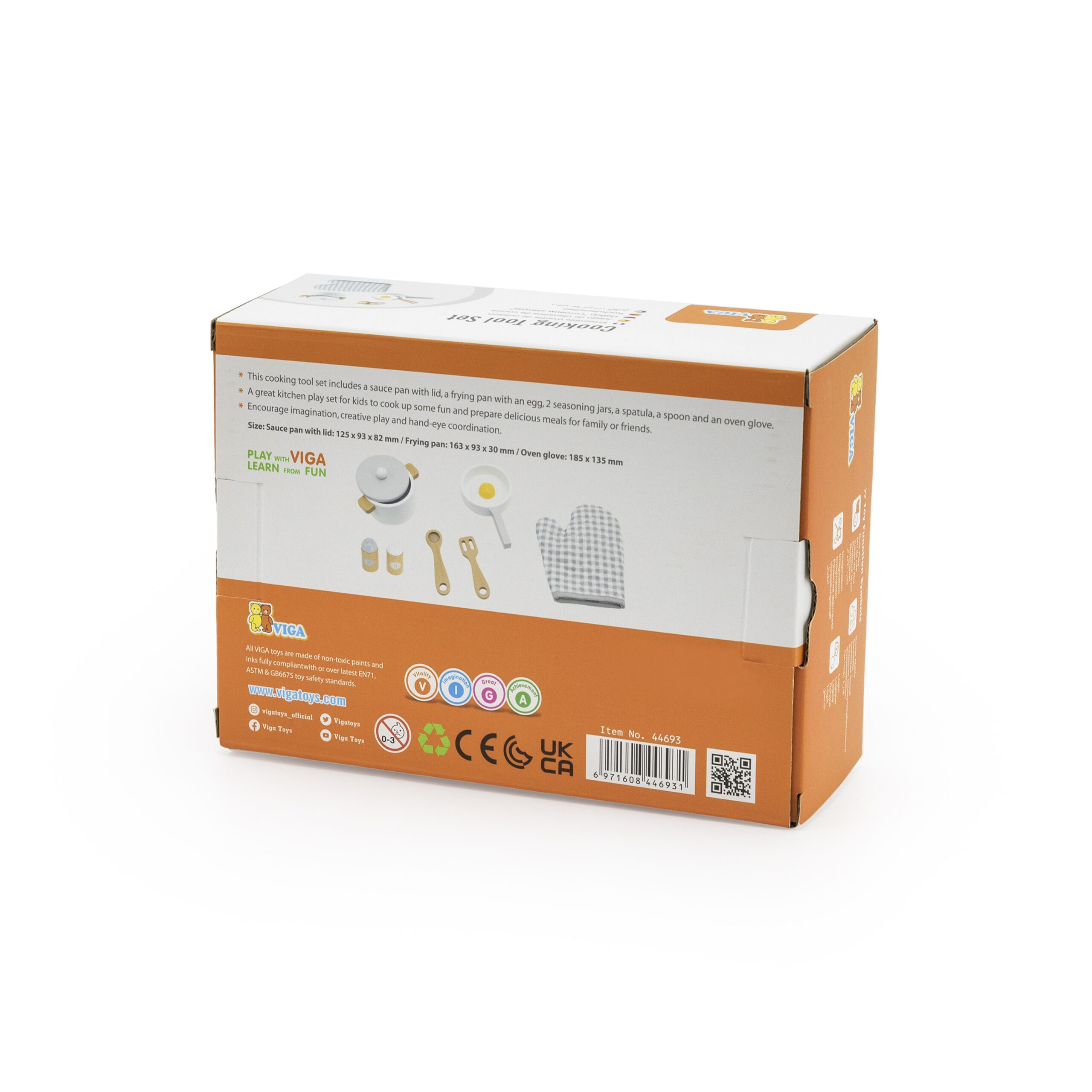 VIGA virtuvės rinkinys yra puikus žaidimų rinkinys vaikams, leidžiantis ruošti smagius patiekalus šeimai ir draugams. Jis skatina vaizduotę, kūrybišką žaidimą bei rankų ir akių koordinaciją. Rinkinį sudaro puodas su dangčiu, keptuvė su kiaušiniu, du prieskonių indeliai, mentelė, šaukštas ir kepimo pirštinė.