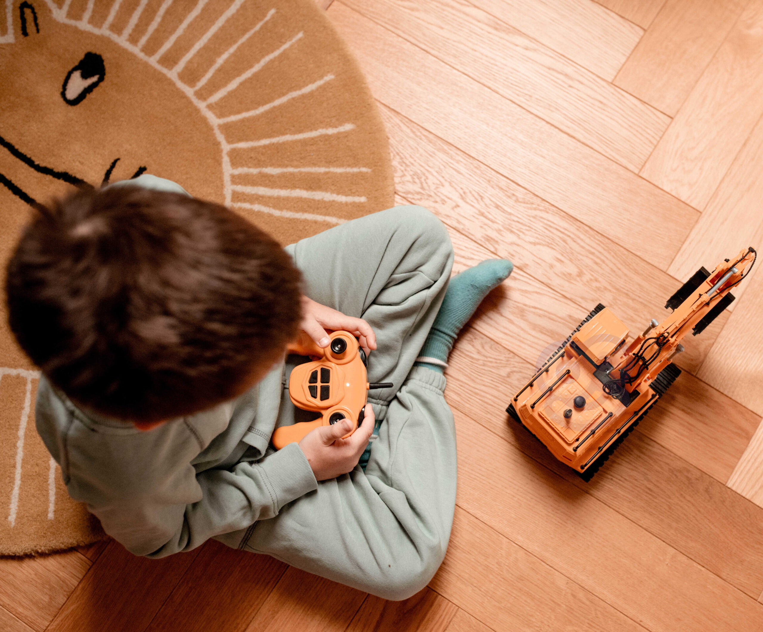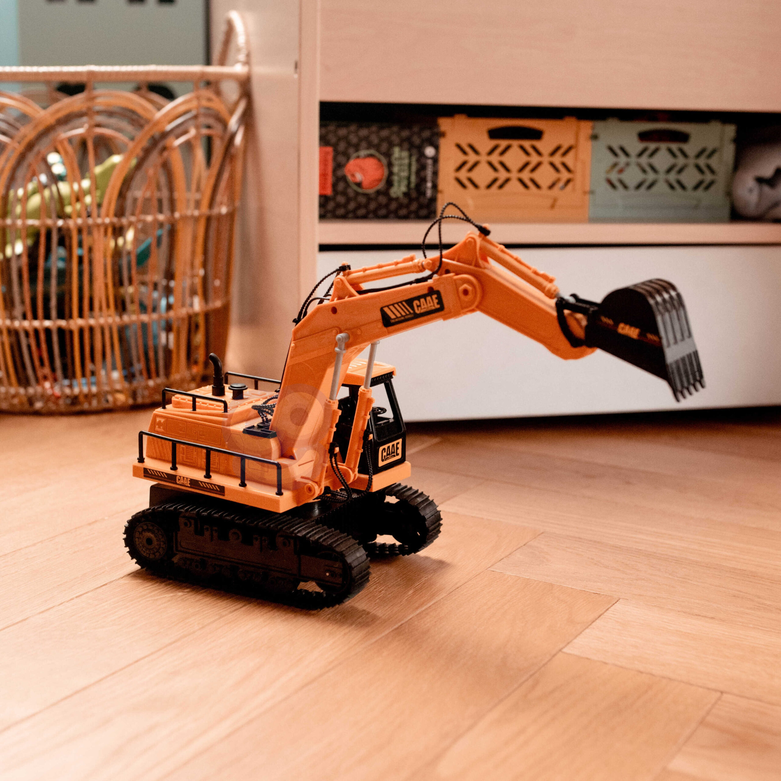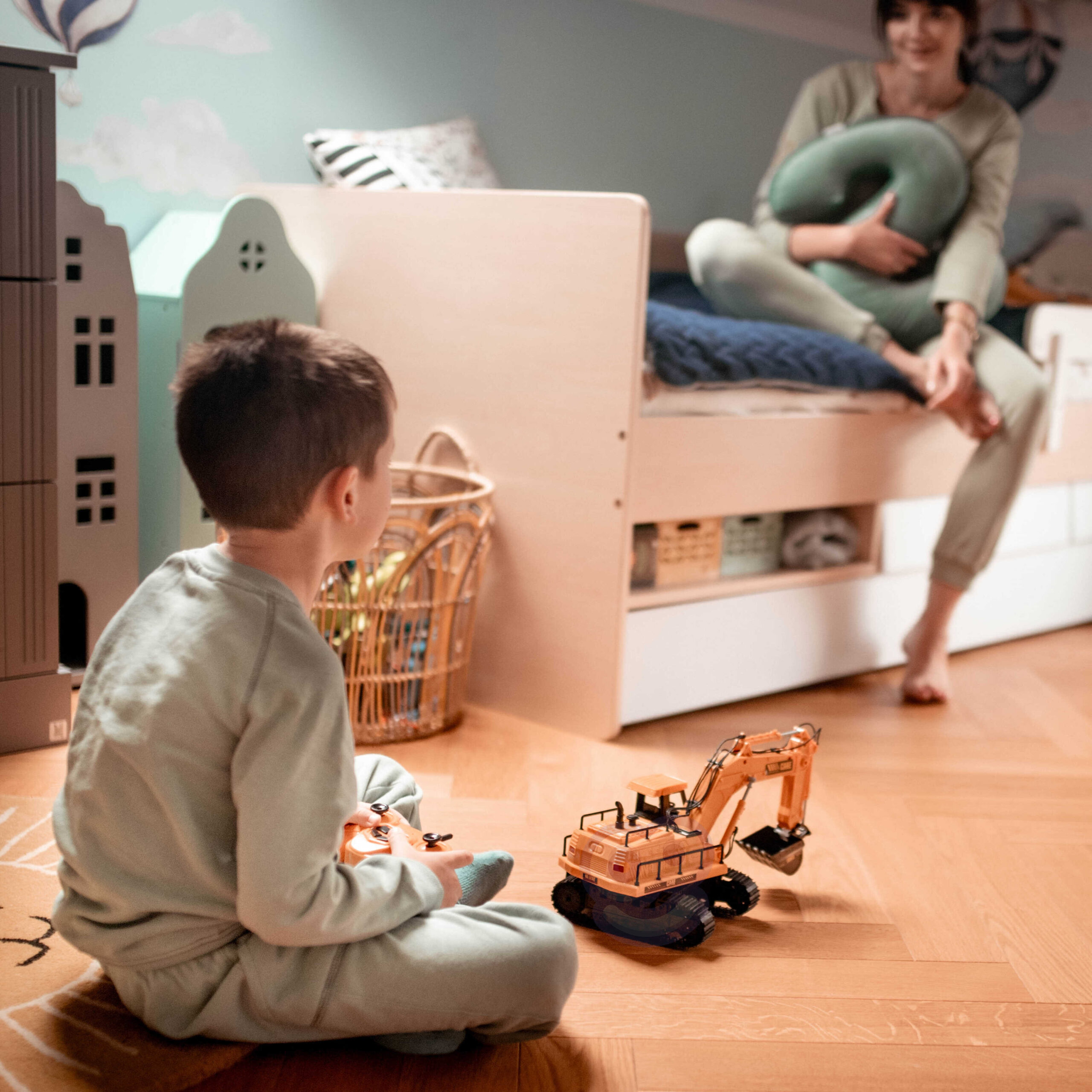 Nuotoliniu būdu valdoma „WOOPIE“ ekskavatoriaus kopija – puikus žaislas kiekvienam mažam statybinės technikos gerbėjui. Transporto priemonė pagaminta iš aukštos kokybės plastiko, turi plačius guminius vikšrus, todėl lengvai įveikia net sudėtingesnį reljefą, o žaidžiant namuose nebraižo grindų. Kruopščiai atkurtos detalės leidžia jaustis tarsi valdytum tikrą ekskavatorių (mastelis 1:24). Paversk vaiko kambarį tikra statybų aikštele! Kabinoje yra vairas ir visos reikalingos valdymo svirtys, o ryškios spalvos suteikia žaislui dar daugiau išraiškingumo. 2,4 GHz dažnio pultas užtikrina patikimą valdymą ir išskiria šį modelį iš kitų. Puikiai tinka žaisti tiek vienam, tiek su tėvais ar draugais. Rinkinyje taip pat yra įspėjamieji ženklai ir kūgiai, leidžiantys sukurti tikrą statybų zoną.