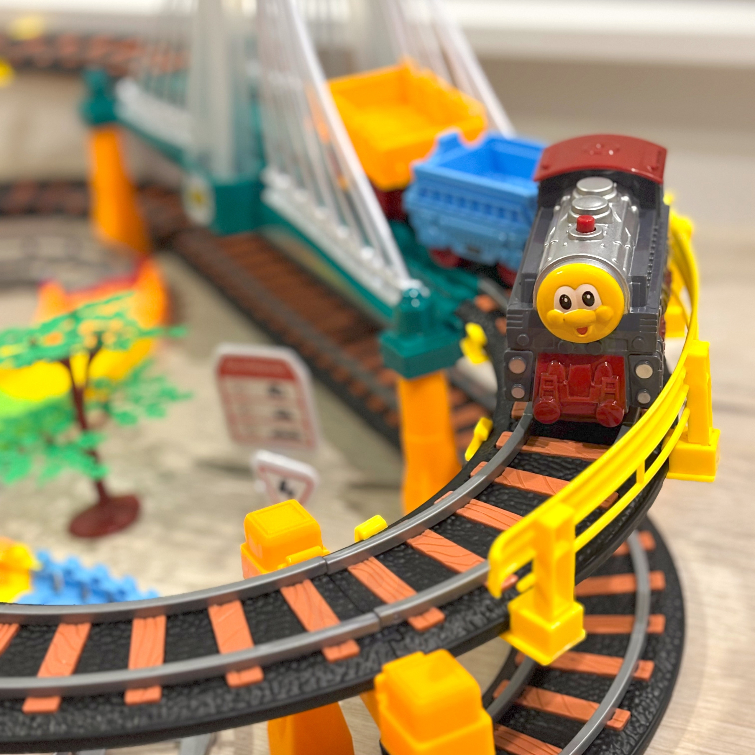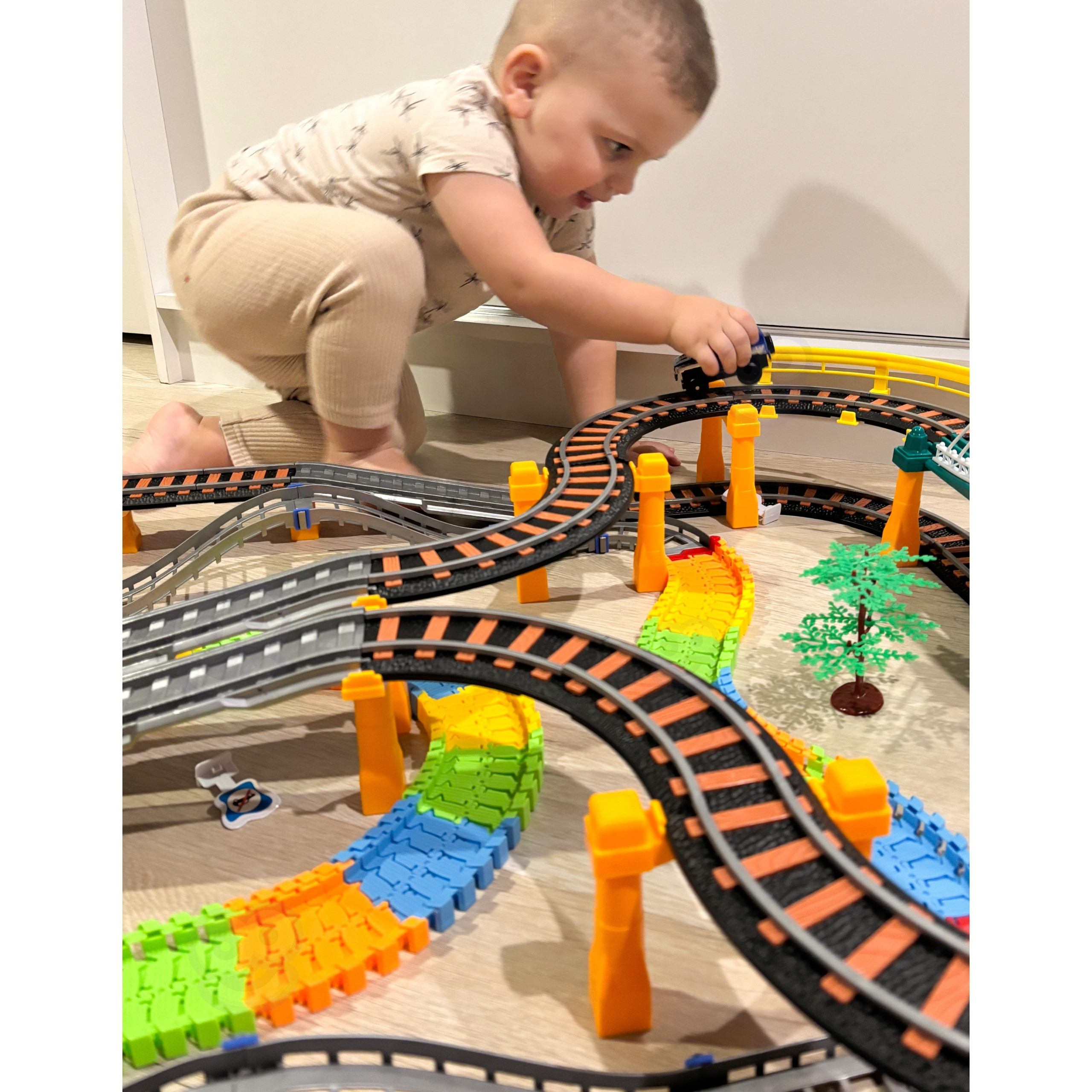„WOOPIE“ 2in1 lenktynių trasa + elektrinis traukinys buvo sukurta mažiesiems lenktynių entuziastams! Papildomas rinkinio privalumas – įtrauktas traukinys ir viadukas. Transporto priemonės važiuoja atskiromis trasomis, todėl tai puikus 2in1 žaislas. Lokomotyvas tempia du vagonus, kuriuos mažasis geležinkelininkas gali pakrauti. Trasos yra nepriklausomos – galima vienu metu naudoti tiek traukinį, tiek automobilį. Žaislo ryškios spalvos ir kokybiškas atlikimas sukuria išskirtinę atmosferą ir suteikia realistišką išvaizdą. Rinkinyje taip pat yra medžių ir kitų aplinkos elementų, kurie papildo trasos aplinką. Rinkinį sudaro 192 dalys, įskaitant lokomotyvą, automobilį ir pakeliamą tiltą su spalvotomis šviesomis. Papildomas privalumas – realistiškas traukinio garsas! Šis žaislas yra visiškai saugus vaikams. Žaisdami mažyliai lavina savo rankinius įgūdžius ir vaizduotę.