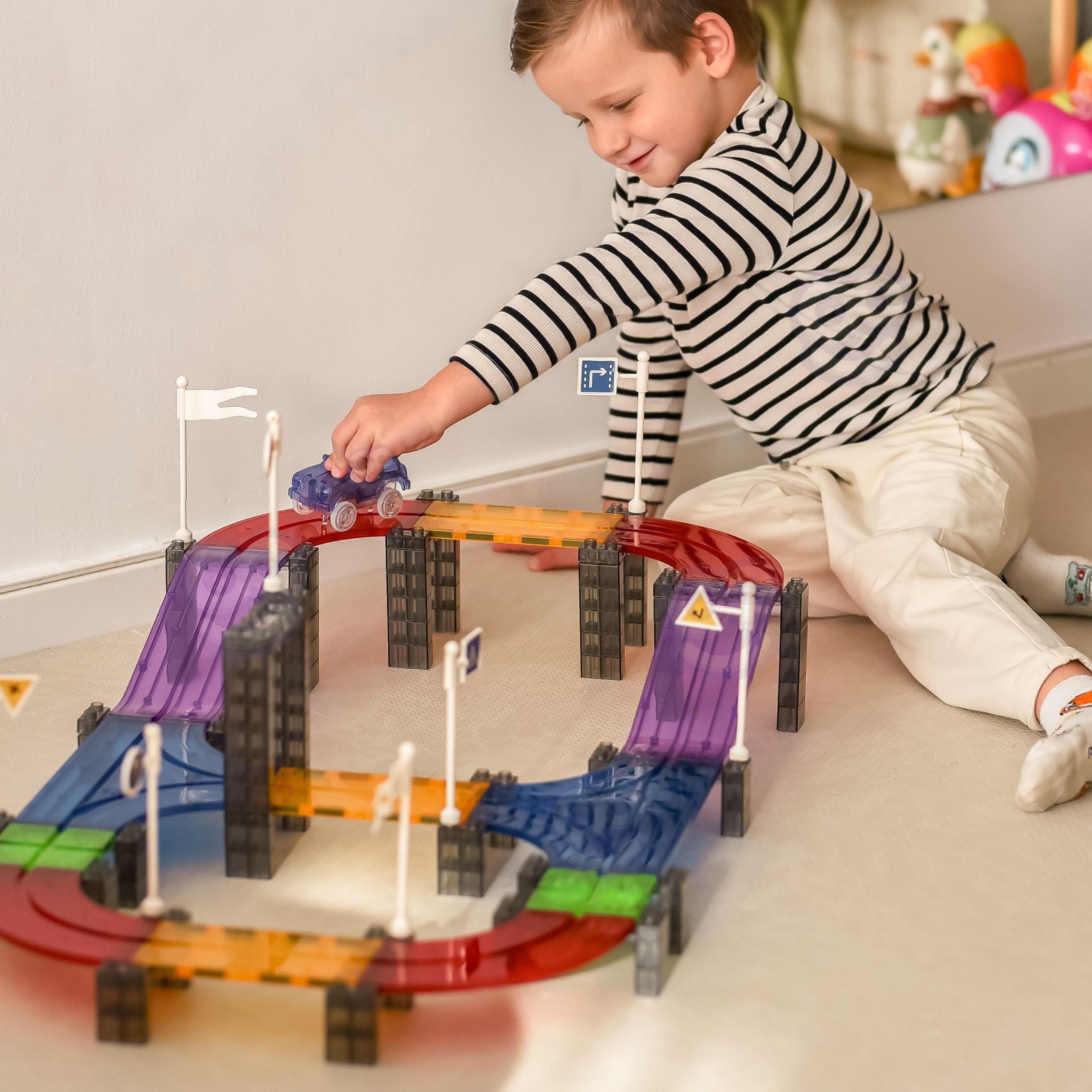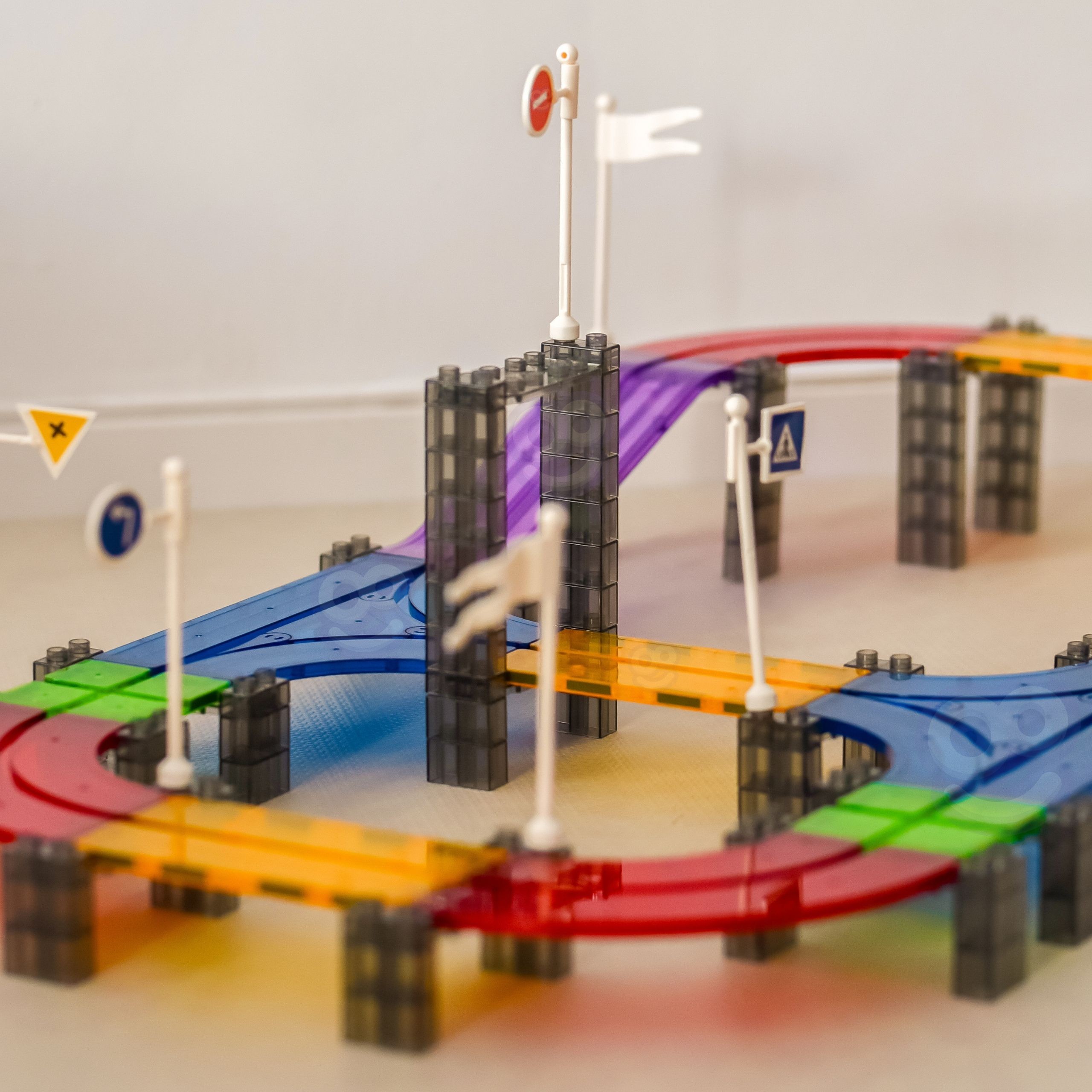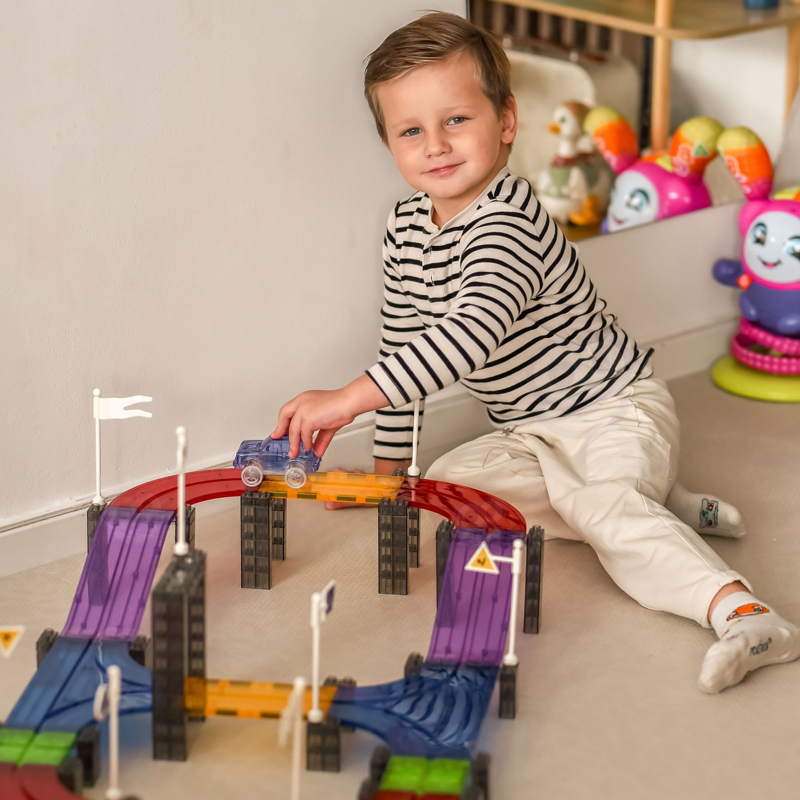 „WOOPIE“ magnetinė lenktynių trasa – tai išskirtinis žaislas, kuris pažadina kiekvieno vaiko kūrybiškumą ir paverčia žaidimą įspūdingu nuotykiu su šviesomis ir spalvomis! Dėl lengvai sujungiamų magnetinių elementų mažyliai gali savarankiškai kurti įvairias daugiaaukštes trasas, kuriomis važiuoja šviečiantis automobilis. Skaidrios, spalvingos detalės ir ryškūs LED efektai daro žaidimą itin įtraukiantį tiek dieną, tiek naktį.