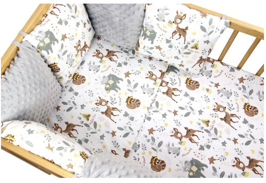 Puikus 11 dalių lovelės komplektas. Patalynė pagaminta iš lenkiškos medvilnės, sertifikuotos pagal „Oeko-Tex Standard 100“.