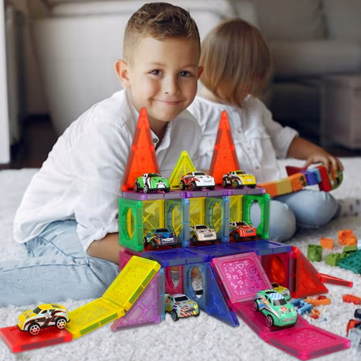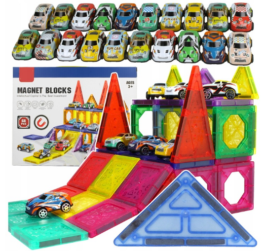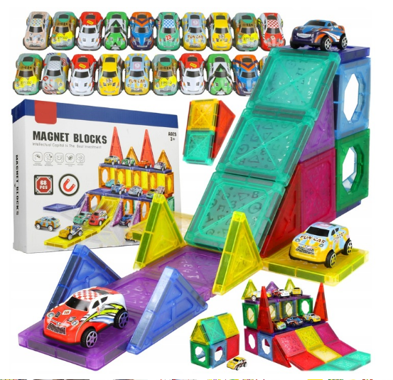 1️⃣ Kūrybiškas žaidimas: su magnetiniais kaladėlėmis vaikai gali susikurti savo automobilių trasą. Tai ne tik smagu, bet ir lavina jų vaizduotę bei dizaino įgūdžius.