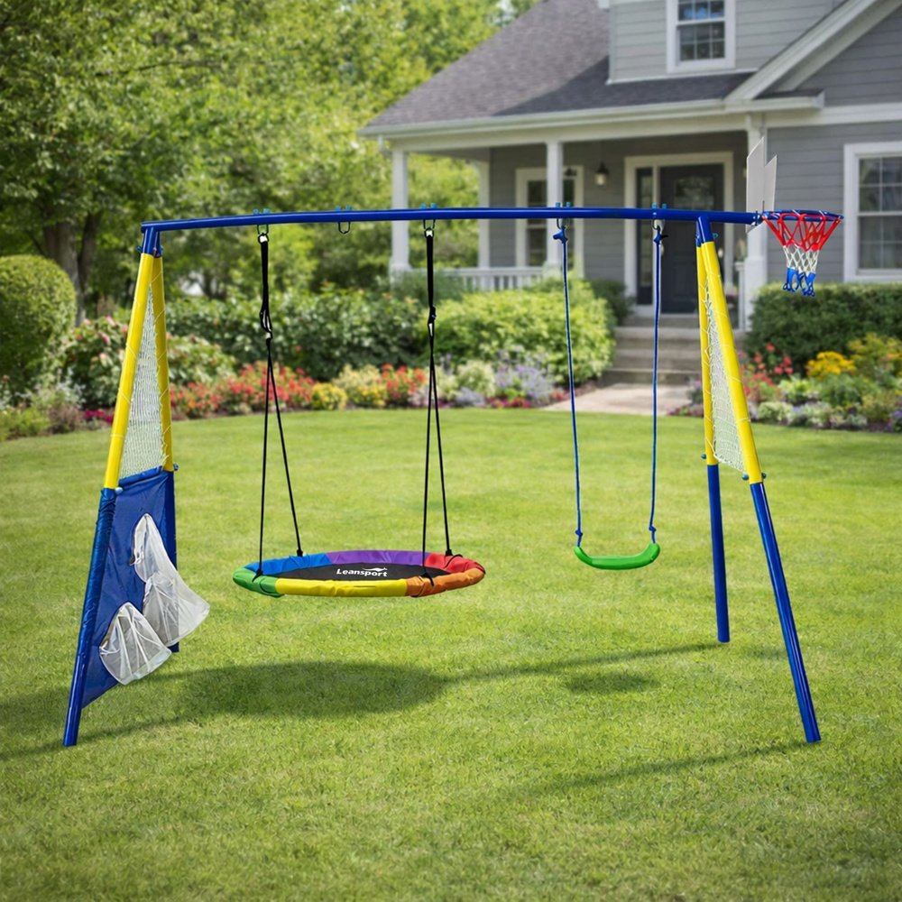 Pagrindinis » Parduotuvė » 4-in-1 Sodo žaidimų aikštelė – supynės, gandro lizdas, krepšinio lankas, metalinis rėmas