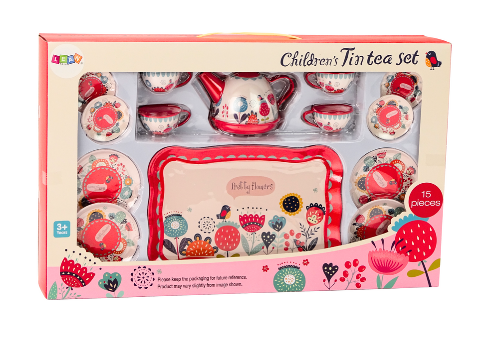 Šis raudonas arbatos ir kavos rinkinys – žavingas, spalvingas ir puikiai tinkantis vaikų vaidmenų žaidimams. Rinkinį sudaro padėklas, arbatinukas, 4 puodeliai, 4 lėkštutės ir 4 desertinės lėkštės, dekoruotos mielais gėlių motyvais, kurie suteikia žaismui elegancijos ir žavesio.