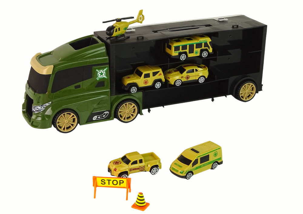 Didelė tralo priekaba talpina iki 6 mažų automobilių, todėl žaidimas tampa dar įdomesnis. Rinkinyje yra 5 automobiliai, sraigtasparnis ir 4 kelio ženklai, leidžiantys sukurti tikrovišką kelių aplinką. Ant tralo stogo įrengta speciali anga, per kurią automobiliai gali nuslysti žemyn – tai suteikia papildomo azarto ir interaktyvumo.