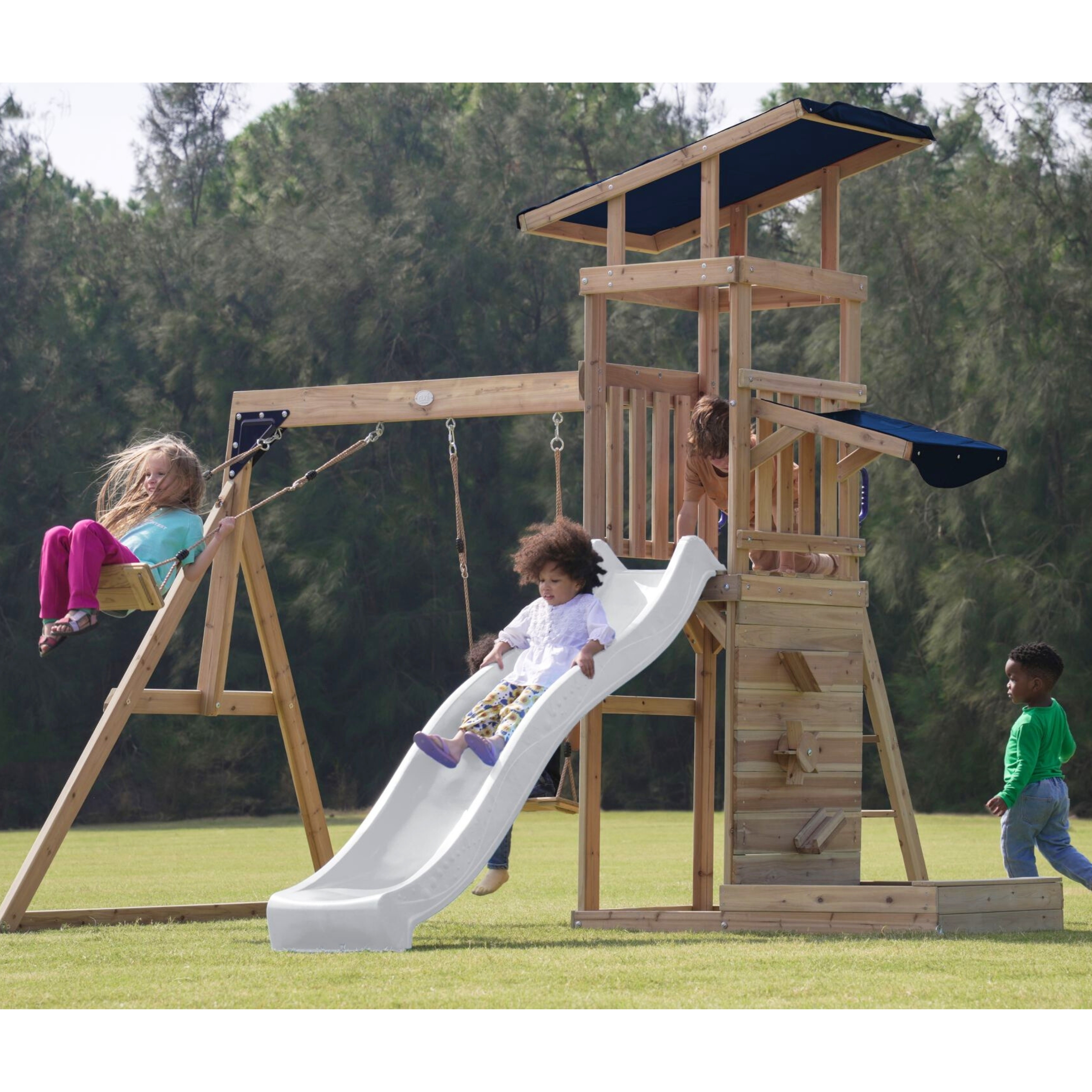 ✔ Dėl įvairių elementų – apžvalgos bokšto, ilgos čiuožyklos, dvigubų sūpynių ir smėlio dėžės – vaikai gali lavinti savo kūrybiškumą, jėgą ir motorinę koordinaciją vienoje vietoje!