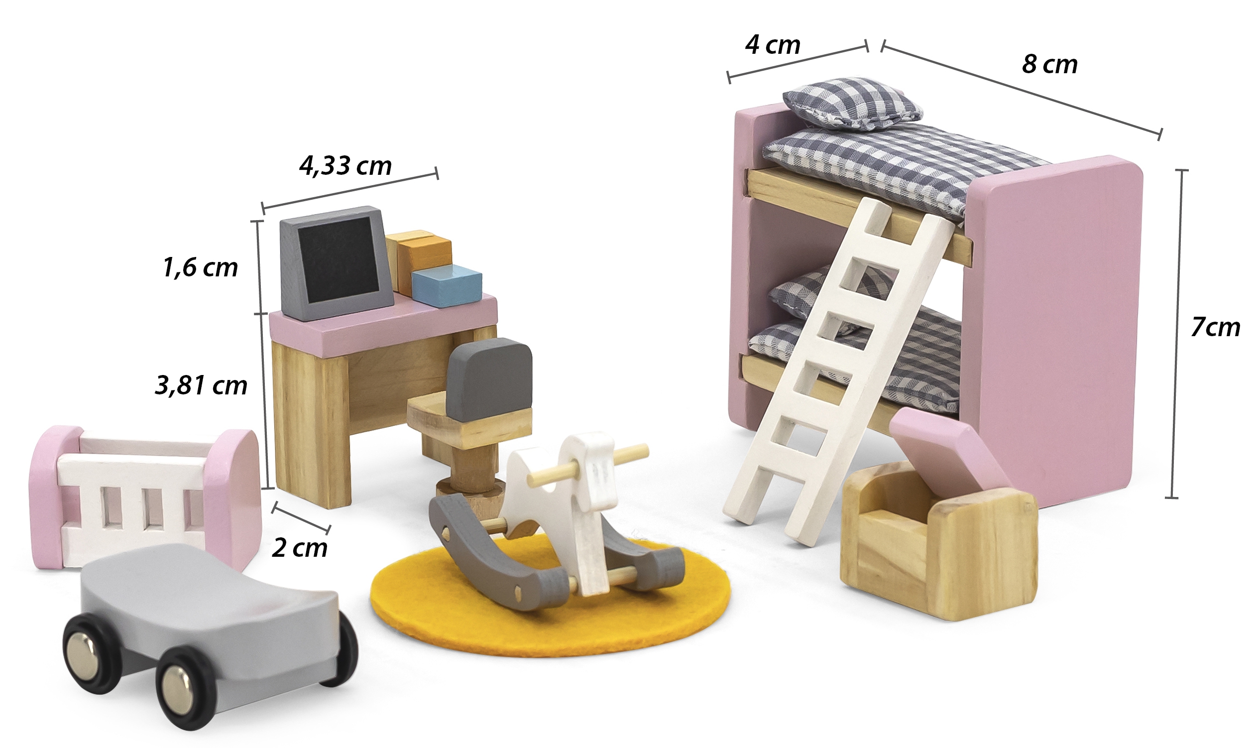 – dviaukštė lova 8 x 4 x 7 cm,