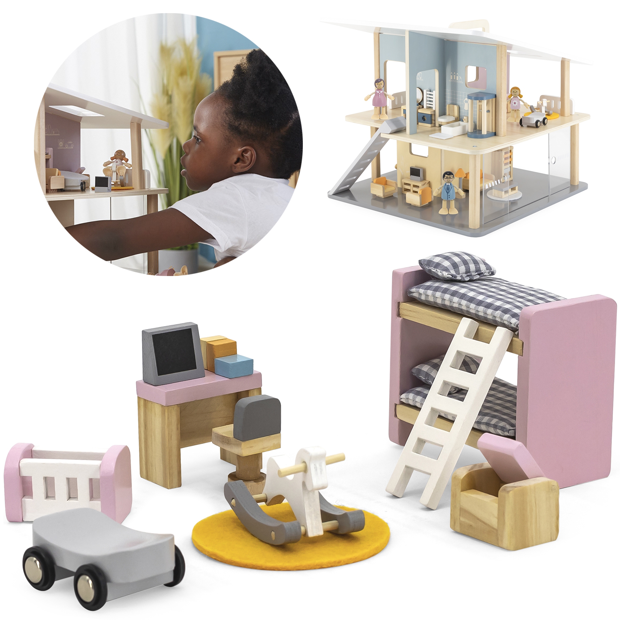 – į komplektą įeina : rašomasis stalas su kompiuteriu, kėdė, lopšys, dviaukštė lova su kopėčiomis, kilimėlis, pasivažinėjimas, supamasis žirgas ir pufas,