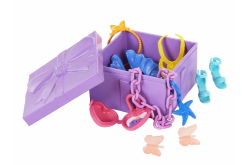 Papildomi stiliaus ir pasakojimo aksesuarai: 2 poros batų, šepetys, galvos juostos ir kt. – didelė dėžutė atsidaro ir užsidaro, kad joje tilptų detalės ir būtų galima sukurti daugiau staigmenų!