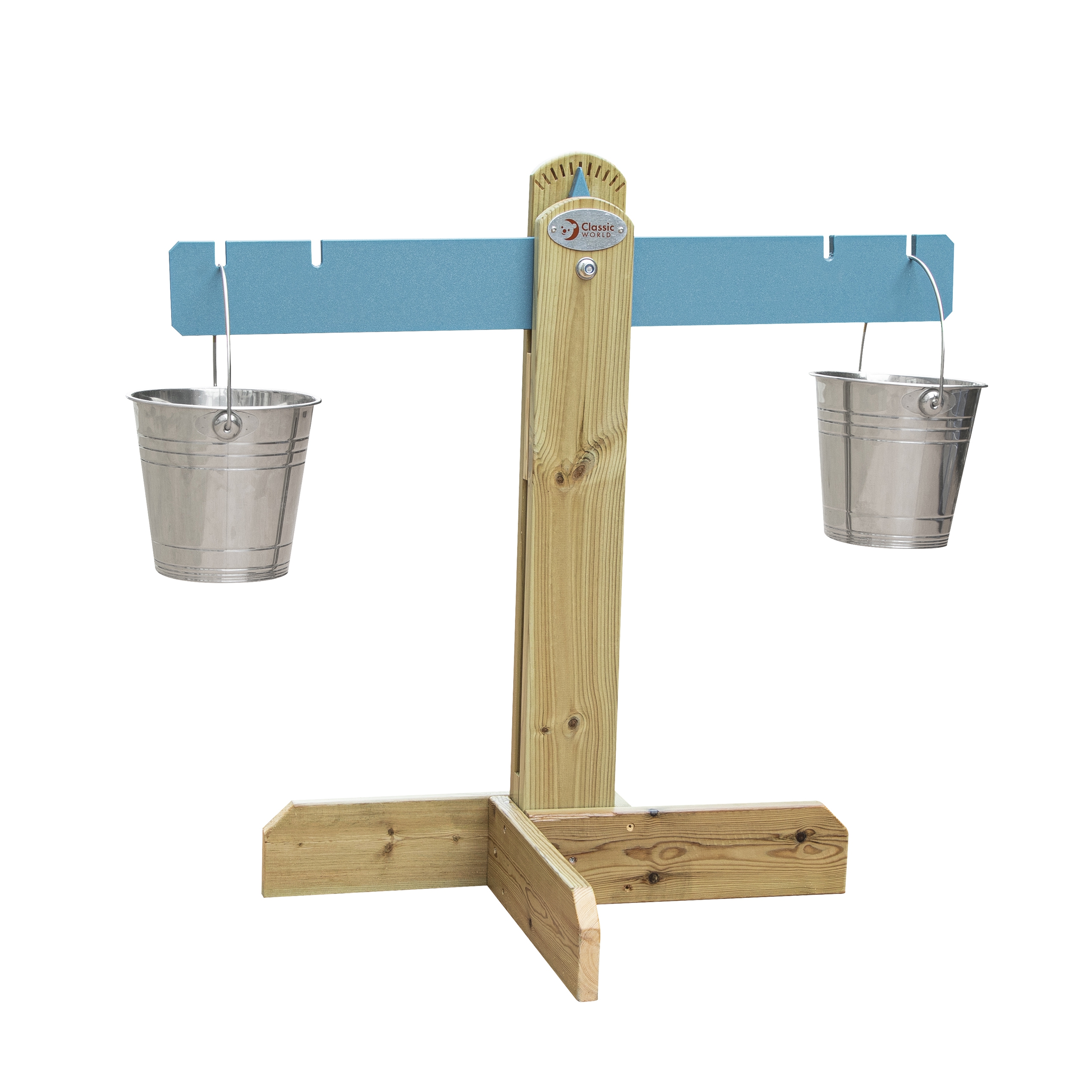 Vaikiškos svarstyklės iš garsaus „Classic World“ prekės ženklo. Gaminys pagamintas iš aukštos kokybės medienos ir dažytas netoksiška , vaikams saugia impregnavimo danga . Pripildykite metalinius kibirus smėliu, vandeniu ir akmenukais, užtikrindami, kad abu kibirai būtų sulygiuoti. Tai idealus rinkinys vaikams lavinti rankinius įgūdžius, kūrybiškumą ir loginį mąstymą. Puikiai tinka jūsų namų sodui!