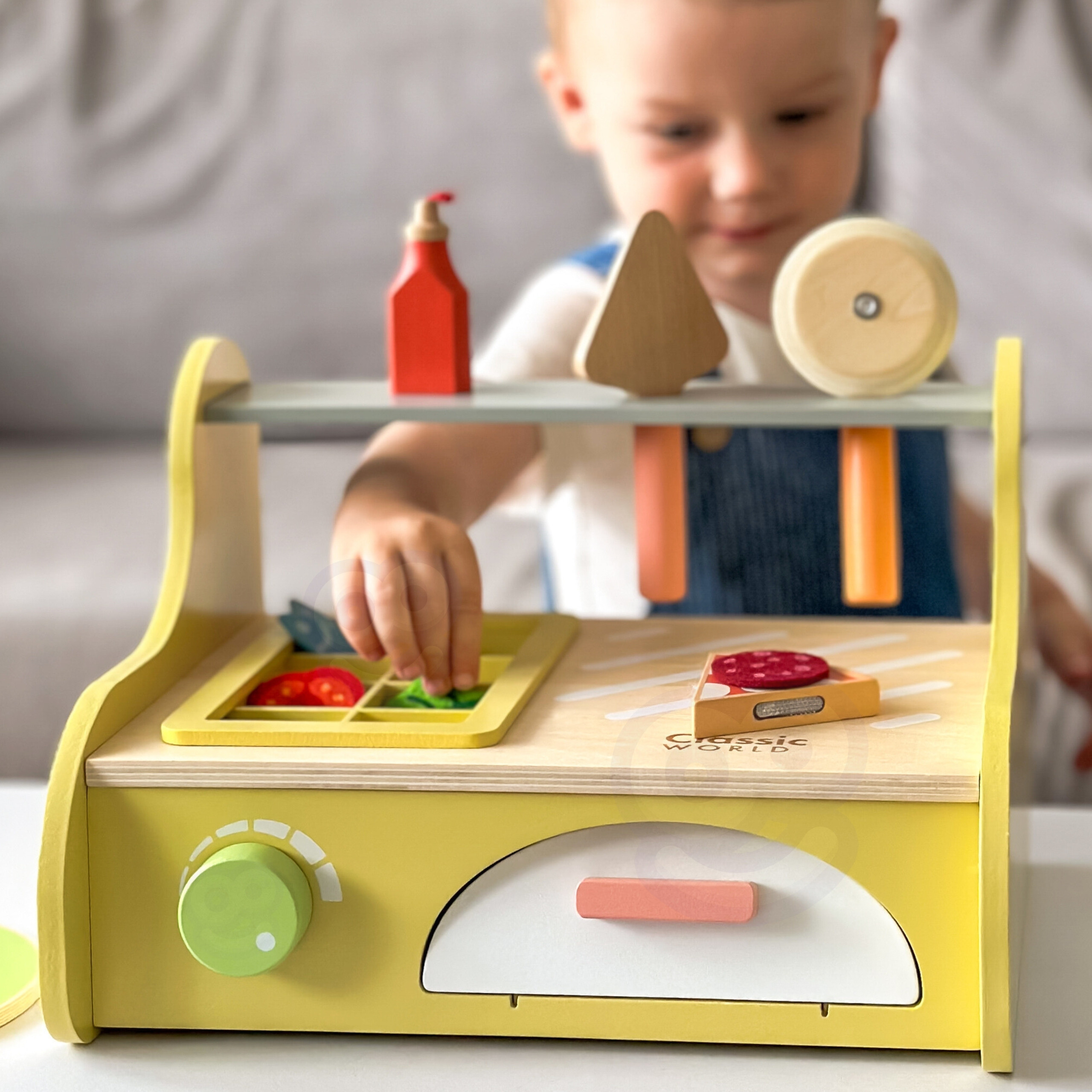 Classic World Wooden Pizza Oven – tai nuostabus vaidmeninis rinkinys mažiesiems virtuvės šefams, kuriame yra viskas, ko reikia iškepti gardžią picą visai šeimai. Rinkinys apima picos krosnį, picos pagrindą, daugybę priedų ir spalvingų veltinių ingredientų, leidžiančių vaikams kurti savo unikalius picos derinius.