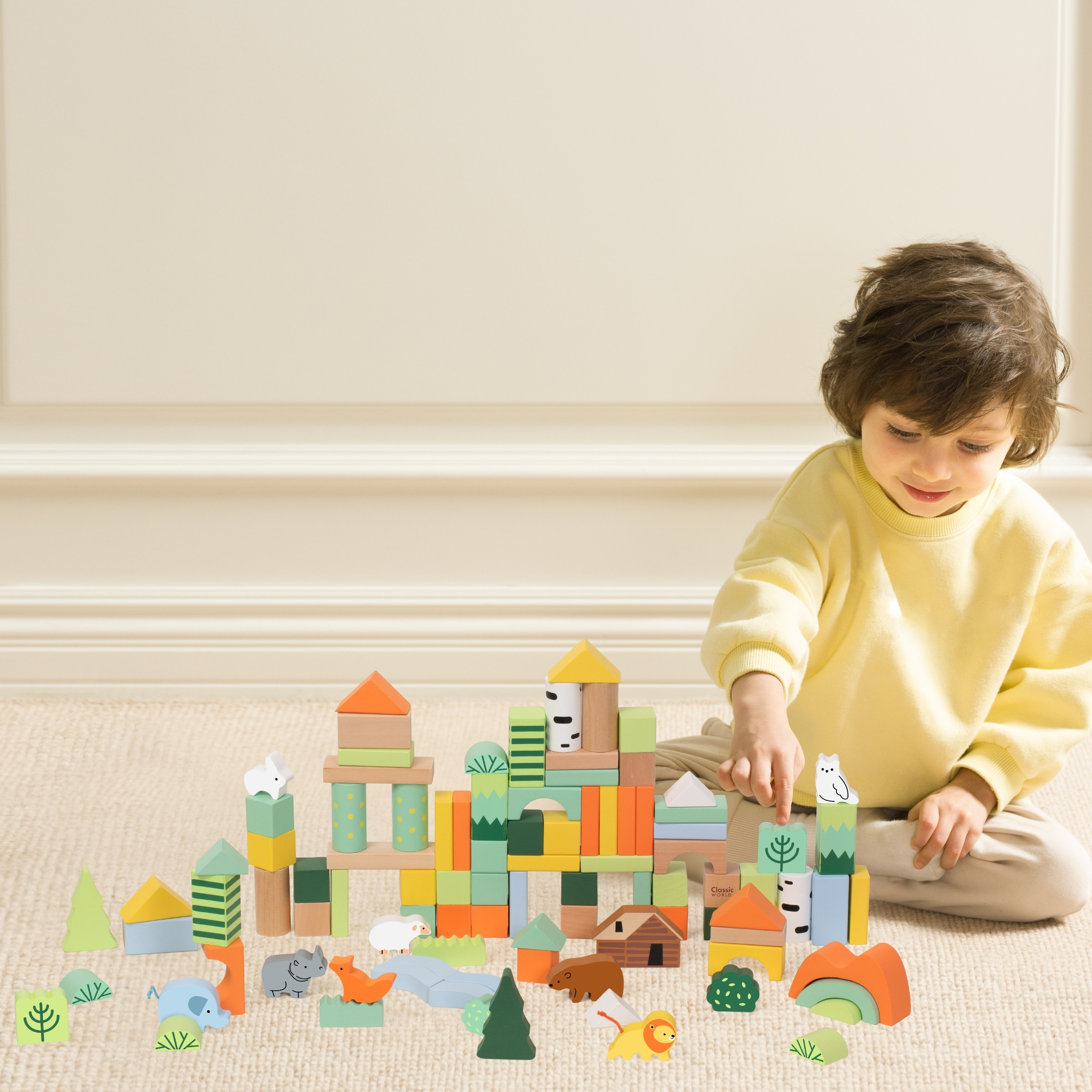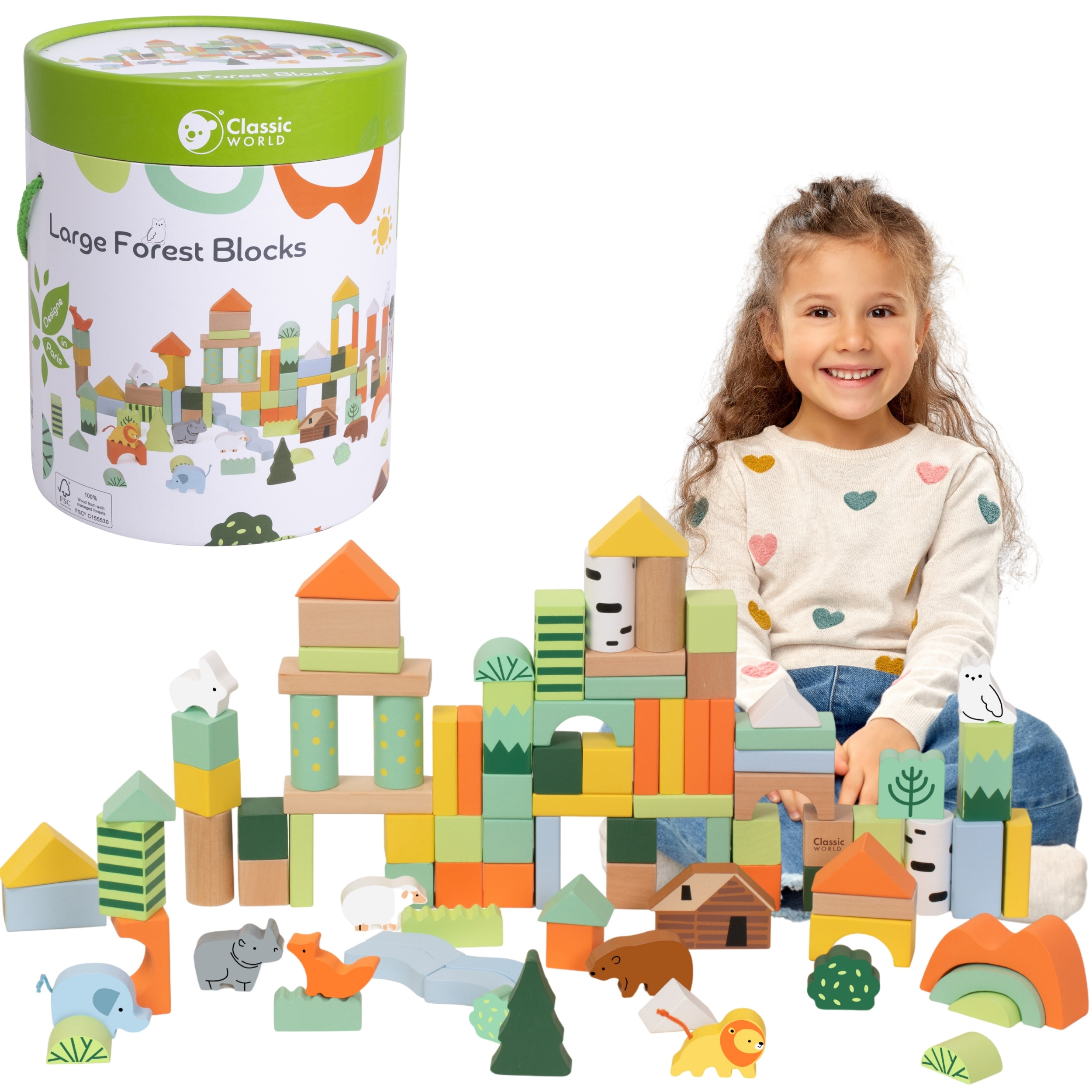 Leiskite vaikams pasinerti į miško pasaulį su Classic World medinių kaladėlių rinkiniu, kuriame net 100 spalvingų elementų. Gyvūnų, medžių ir gamtos motyvai įkvepia kurti istorijas, statyti miško namelius, tiltus, bokštus ar visą gyvūnų karalystę.