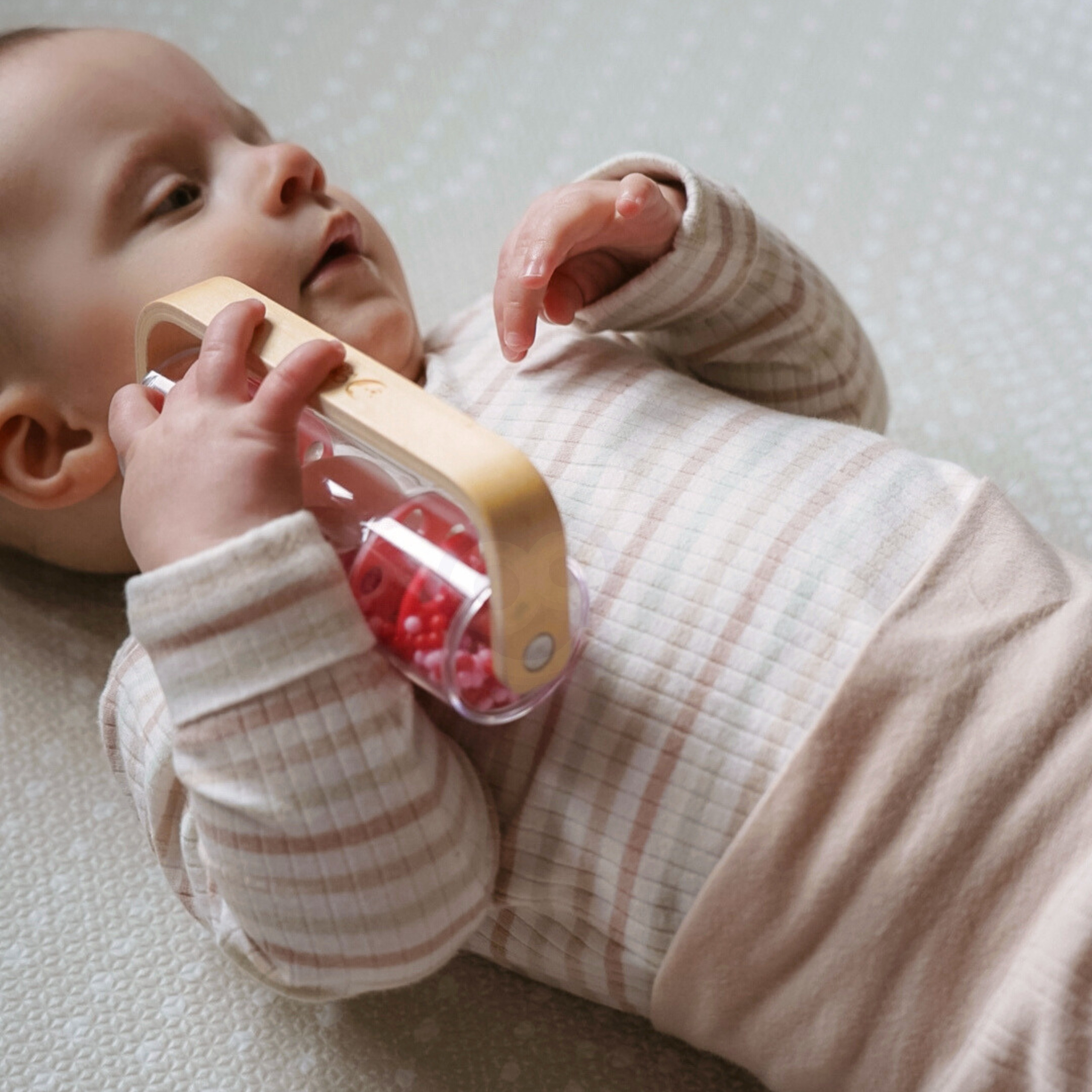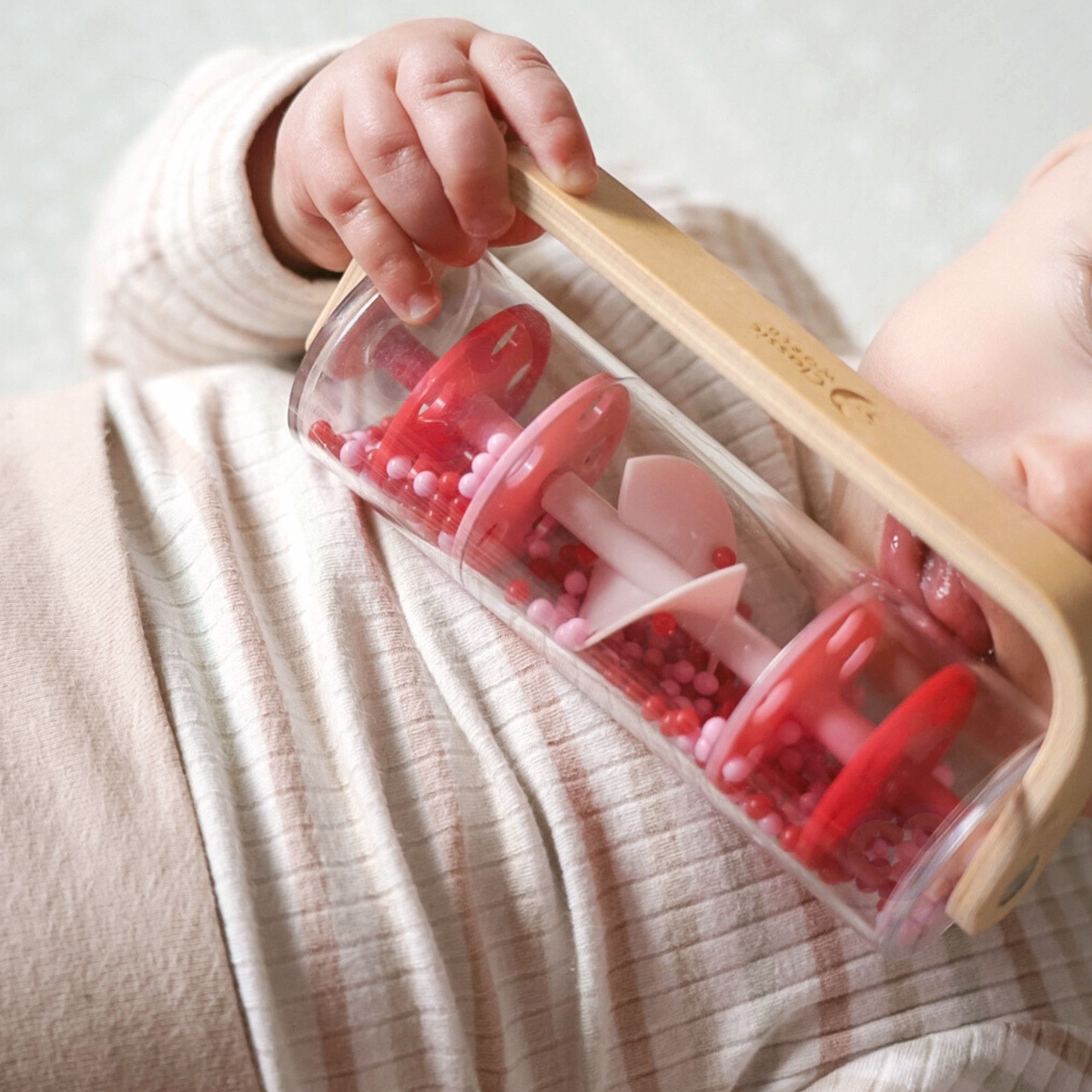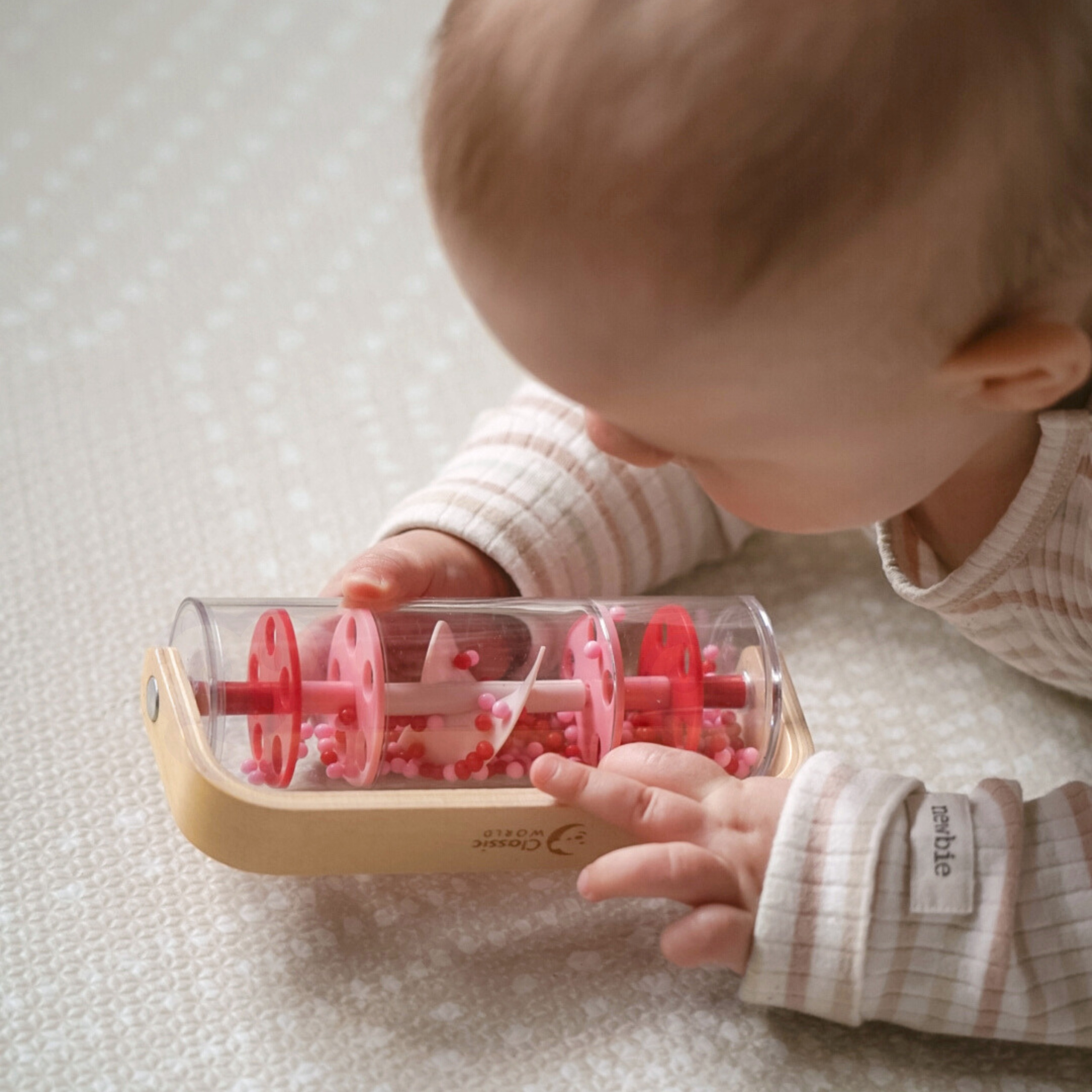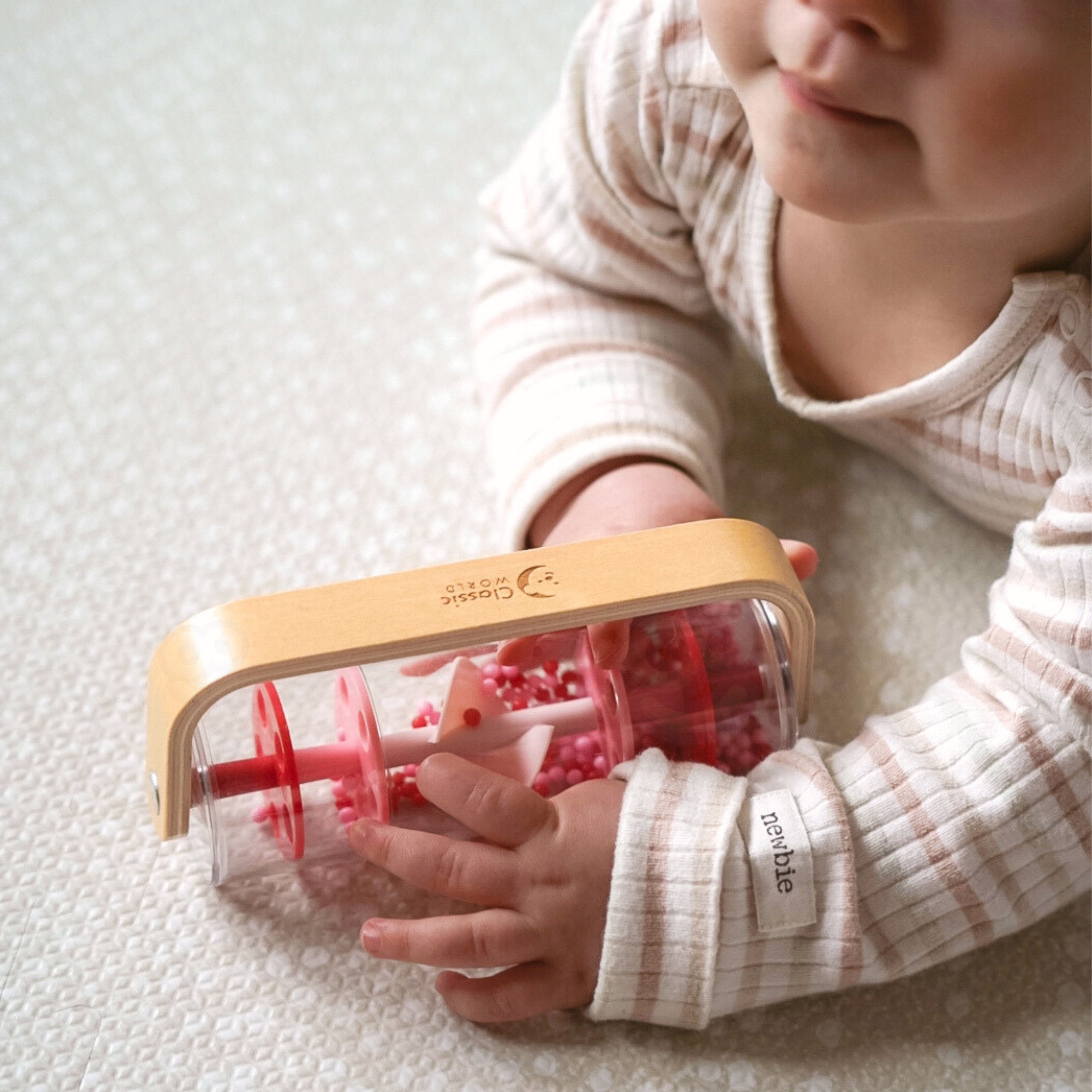 Classic World raudonas lietaus barškutis – tai žaislas, kuris sujungia muziką, sensoriką ir tyrinėjimą. Pakratykite, pasukite ar apverskite – spalvotos granulės krinta žemyn, sukurdamos švelnų, raminantį lietaus garsą, kuris traukia mažylio dėmesį ir ramina.