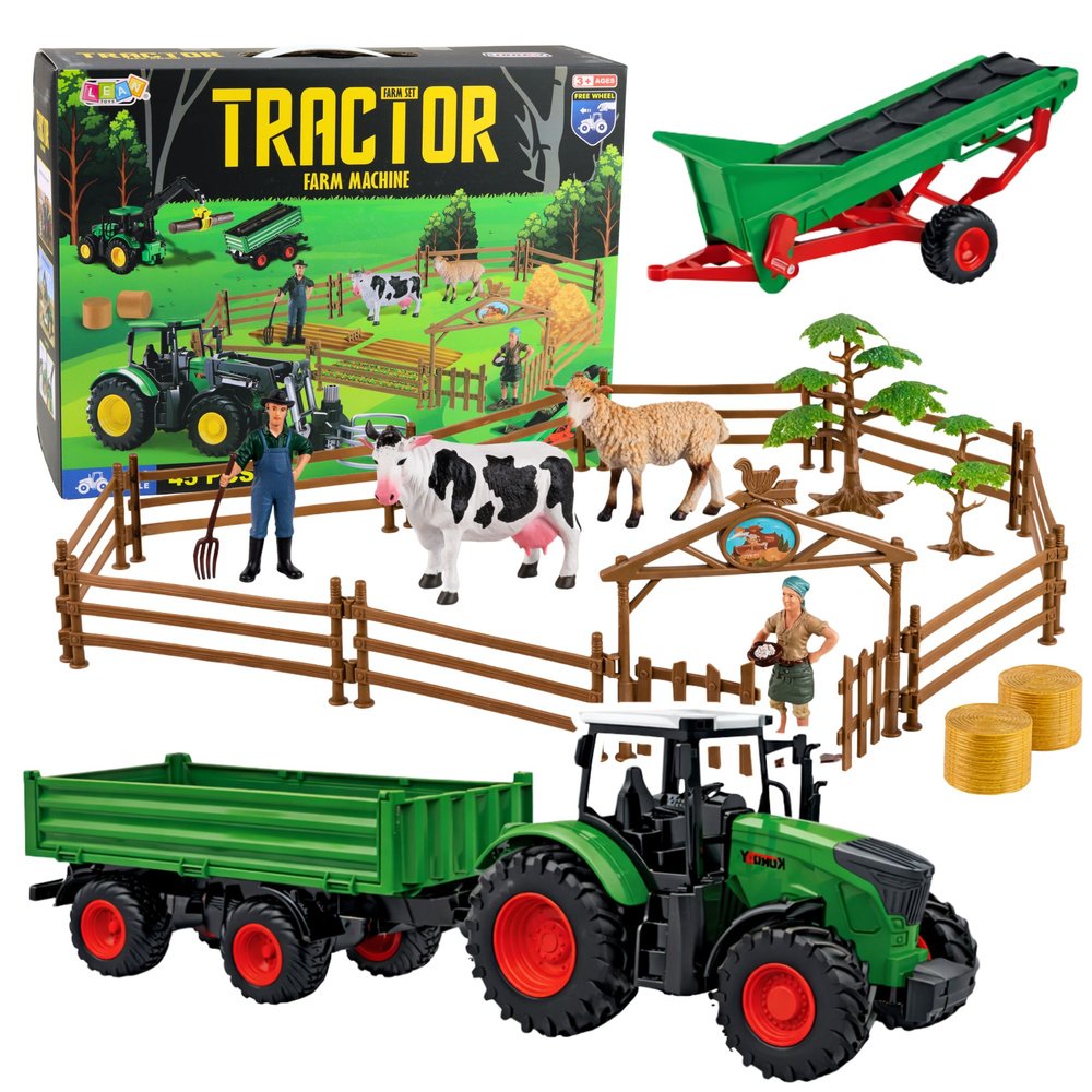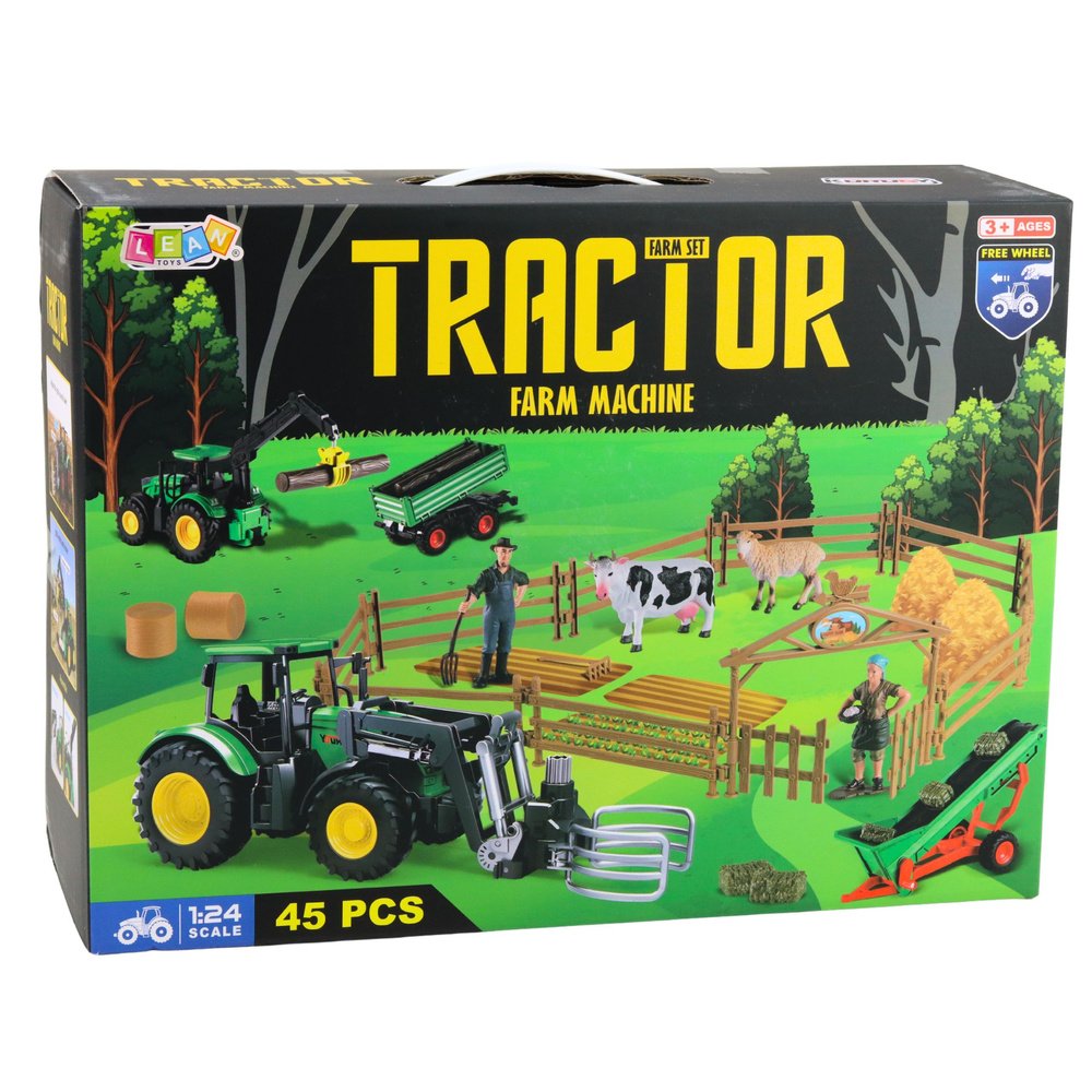 Rinkinyje yra traktorius, pakeliama priekaba, besisukantis konvejerinis vagonas, vartai, tvorelės, medžiai, rąstai, įrankiai, ūkininkai, karvė, avis, šieno ryšuliai ir žolės šėryklos.