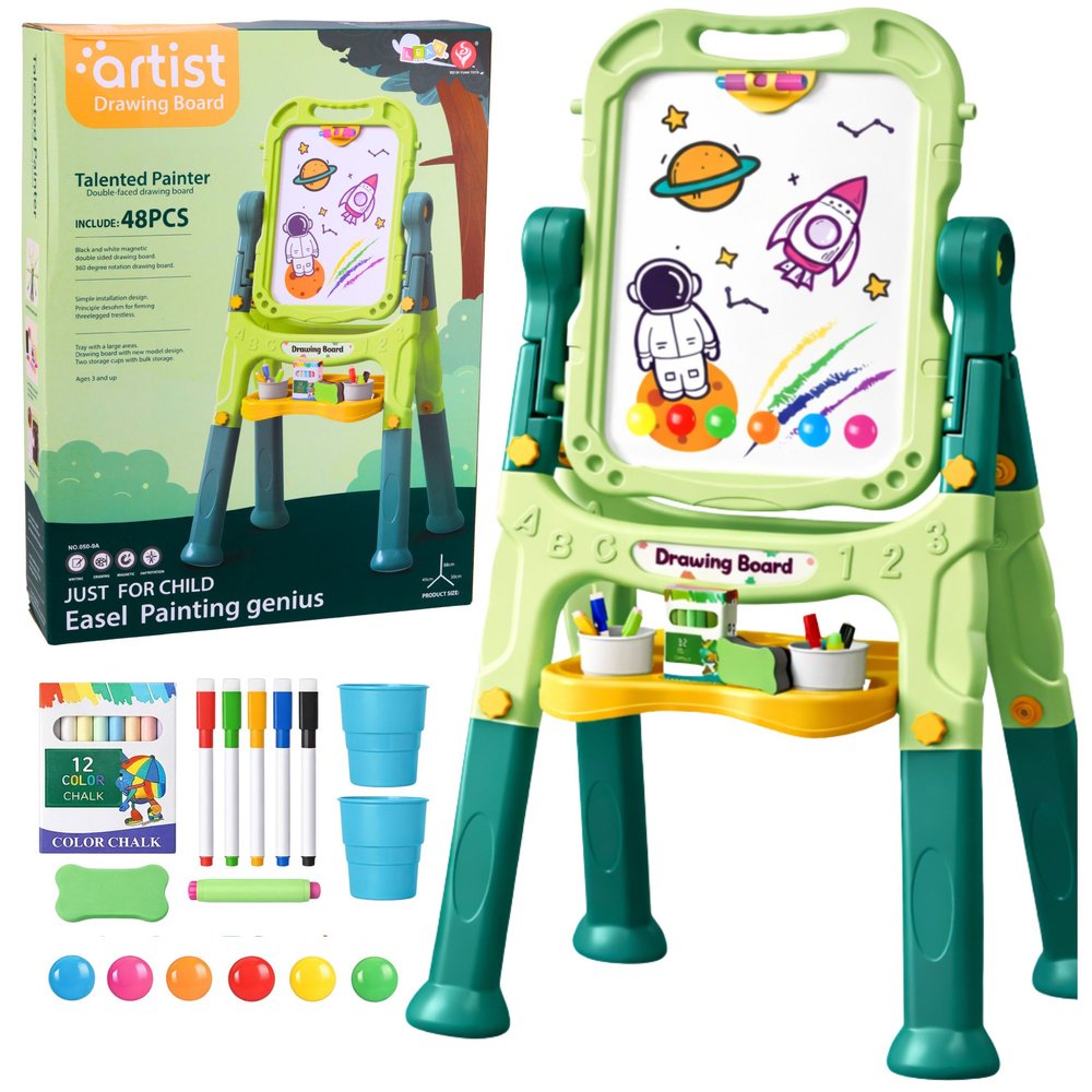 Rinkinyje yra viskas, ko reikia pradėti žaisti iš karto: kreidelės, markeriai, magnetai, kempinėlė, kreidelių laikiklis ir dvi priedų talpyklos. Tai puikus būdas vaikui mokytis raidžių, skaičių, pirmųjų žodžių, piešti, atlikti paprastas matematines užduotis ir lavinti smulkiąją motoriką. Lenta skatina kūrybiškumą, loginį mąstymą ir savarankišką mokymąsi.