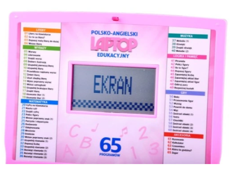 Edukacinis nešiojamas kompiuteris vaikui – tai pasiūlymas kiekvienam kūdikiui, praturtinančiam žinias. Žaislas, turintis 65 funkcijas, leis jums išmokti lenkų ir anglų kalbų rašybos taisykles, matematikos, spręsti paprastas užduotis, žaisti įdomius žaidimus.
