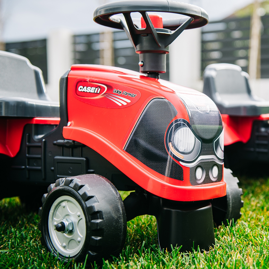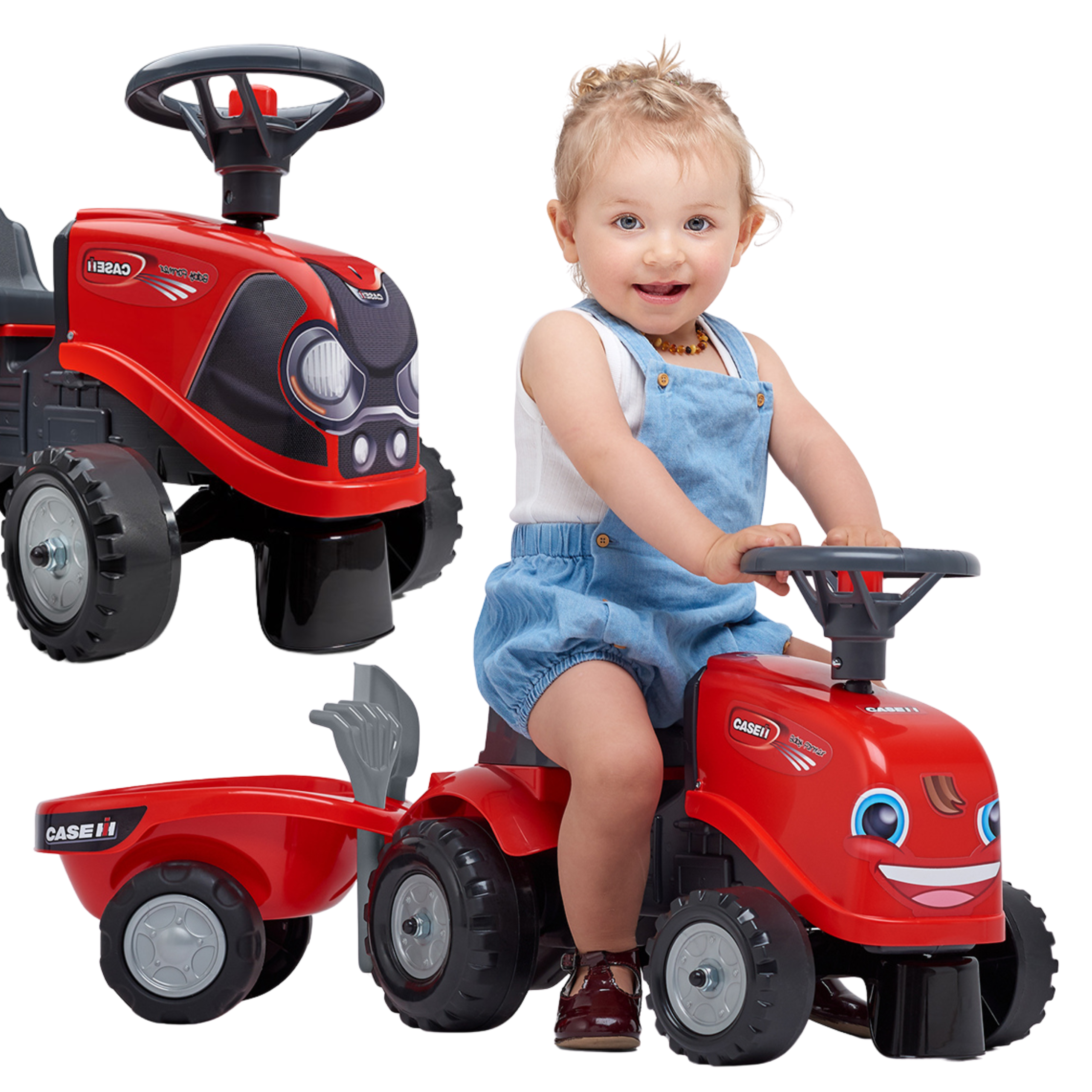 FALK mažylis „ Case IH“ traktoriukas su priekaba – daugelio mažųjų traktorių vairuotojų svajonės išsipildymas . Kruopščiai pagamintas , atsižvelgiant į mažiausias detales ! Joks tikras ūkininkas neatsisakytų tokio traktoriuko. Pagaminta iš aukščiausios kokybės plastiko , ši transporto priemonė tinka vaikams nuo 12 mėnesių amžiaus. Ji turi nuimamą priekabą su panelėmis ir vairą su garso signalu . Traktoriaus ratai pagaminti iš aukštos kokybės plastiko . Be to, prie traktoriaus pridedamas grėblys ir kastuvas, kad jūsų vaikas galėtų žaisti . Pridedami lipdukai leidžia jūsų vaikui pasirinkti savo unikalų stilių. Šypsenėlė ar standartinis lipdukas? Nustebinkite visus, priklijuodami jį ant transporto priemonės priekio.