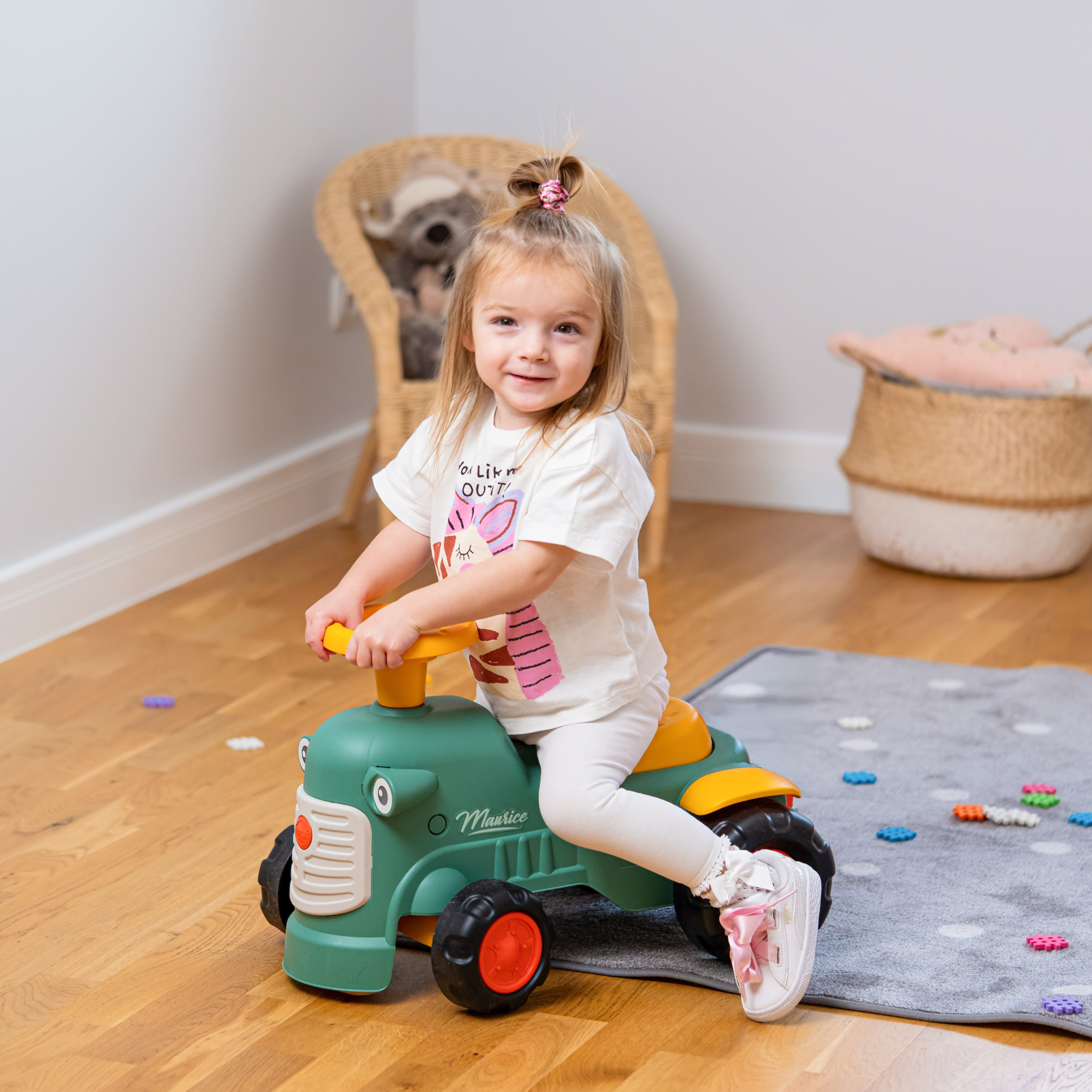Traktoriukas turi veikiantį vairą su signalu ir specialų garsinį raktelį, kuris suteikia papildomos sensorinės patirties. Erdvus, nuimamas priekabos krepšys leidžia mažyliui vežti žaislus, smėlį ar kitus „ūkio darbus“. Tai idealus žaislas aktyviam žaidimui sode, smėlio dėžėje ar namuose.