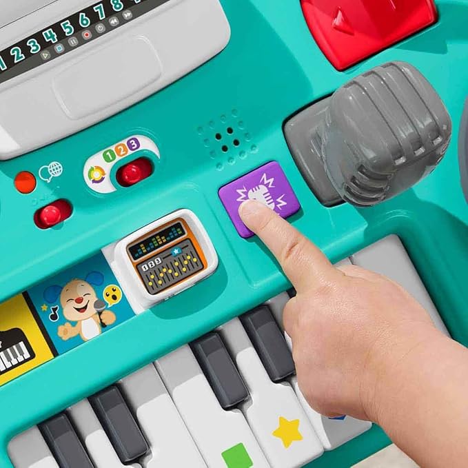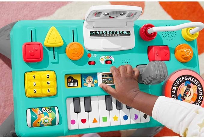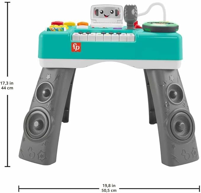 Muzikinis DJ staliukas – tai nuostabus interaktyvus žaislas su daugybe funkcijų ir žaidimo režimų, sukurtas mažylių smalsumui ir lavinimui. Staliuką galima pastatyti ant keturių kojelių, kad vaikui būtų patogu žaisti. Turkio spalvos paviršiuje įmontuota daugybė mygtukų, jungiklių ir žaismingų elementų, kurie, paspaudus, aktyvuoja vis naujas funkcijas.