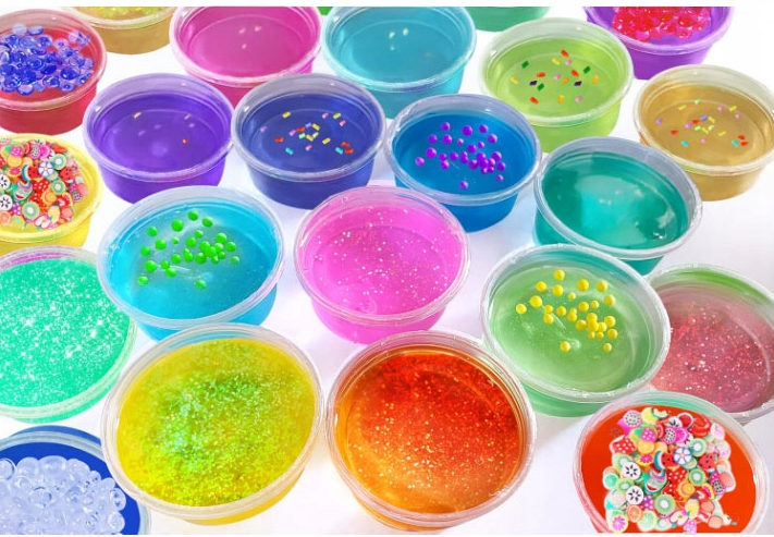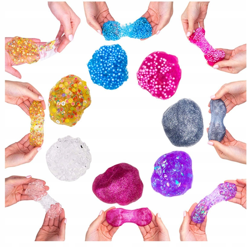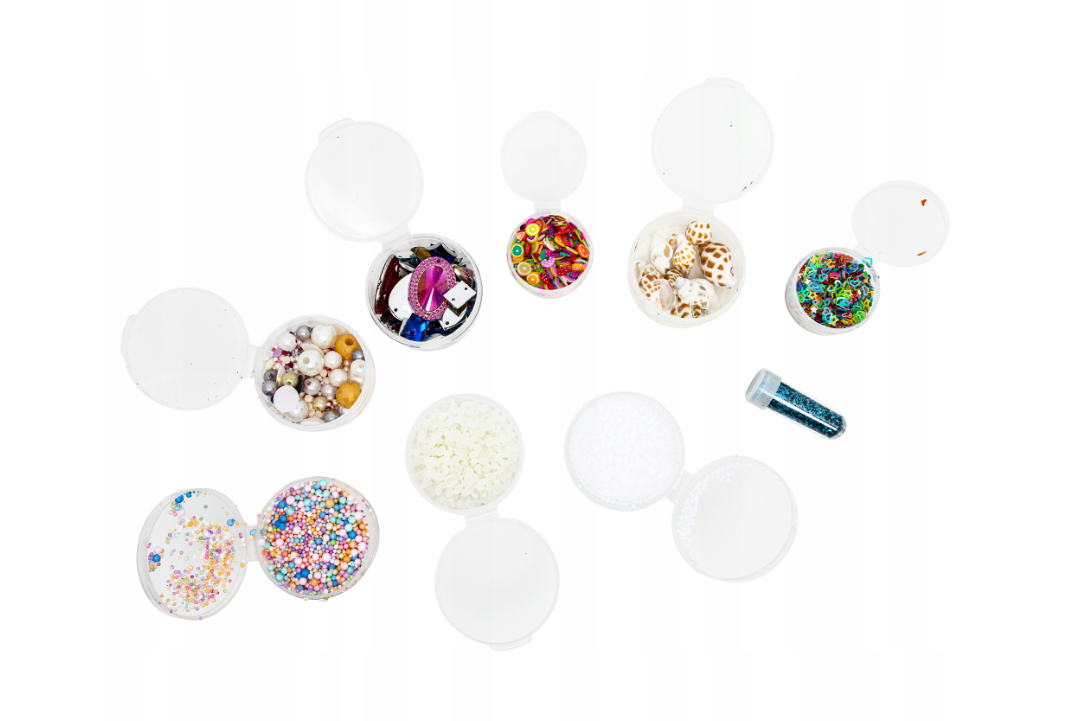 Dėžutėje yra viskas, ko reikia norint sukurti unikalius gleives – nuo spalvingų gleivių iki blizgučių, karoliukų, kamuoliukų ir galiausiai formų bei modeliavimo įrankių.