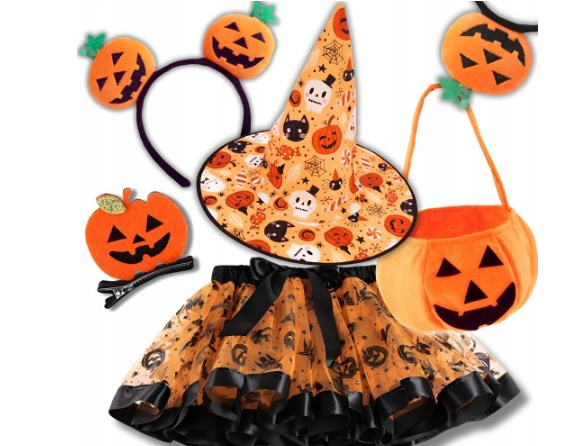 ✅ 6 dalių teminis rinkinys. Rinkinį sudaro sijonas, dera galvos juosta, saldainių krepšelis, kepurė ir 2 moliūgų plaukų segtukai.