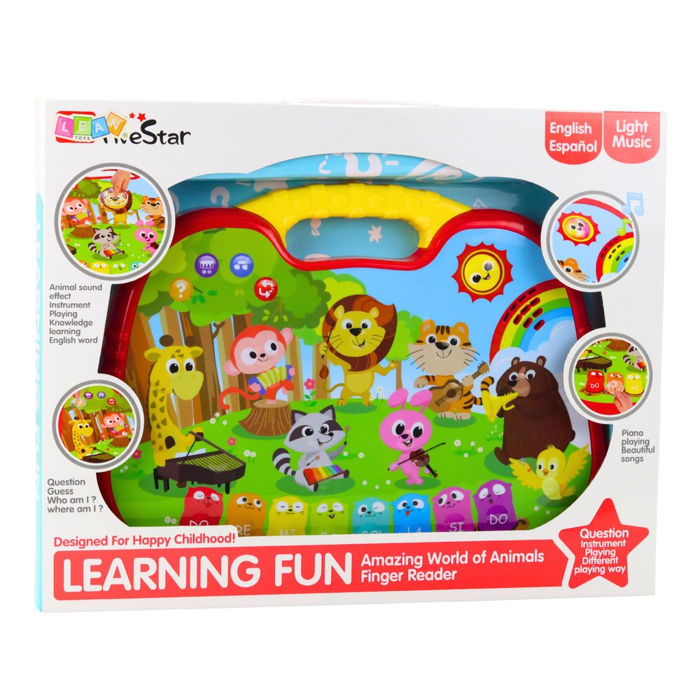 Ši interaktyvi edukacinė lenta – tai modernus mokomasis žaislas, jungiantis garsus, muziką, kalbų mokymąsi ir prisilietimais valdomą žaidimą. Lenta sukurta kaip patogi nešiojama plokštė su rankenėle, todėl ją lengva pasiimti į kelionę, žaidimų kambarį ar darželį. Spalvingi gyvūnų piešiniai kviečia tyrinėti, o jutiklinis paviršius reaguoja į prisilietimus, aktyvuodamas garsus, melodijas ir edukinius pranešimus.