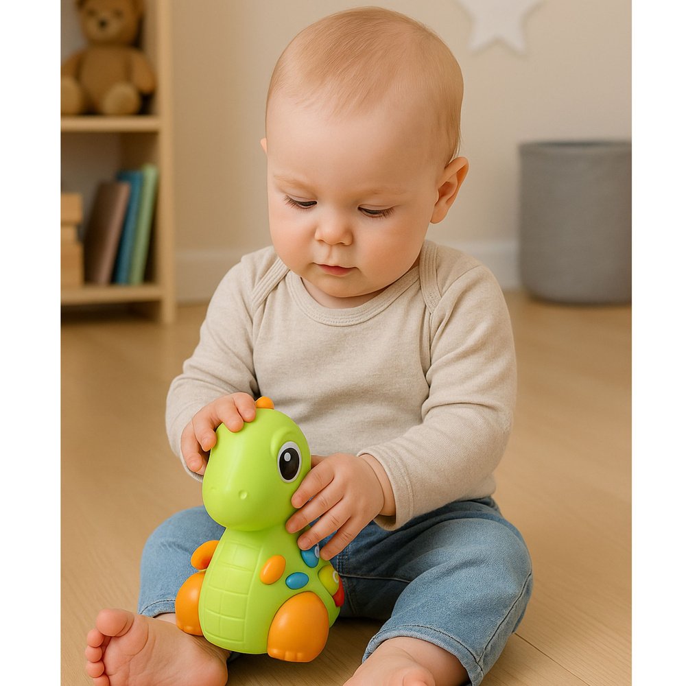 Šis interaktyvus dinozauras – spalvingas, linksmas ir mažyliams itin patrauklus žaislas, skatinantis ropojimą, vaikščiojimą ir aktyvų tyrinėjimą. Dinozauras šviečia, groja linksmą muziką, leidžia garsus ir juda ant ratukų, todėl akimirksniu patraukia vaiko dėmesį ir kviečia sekti paskui.