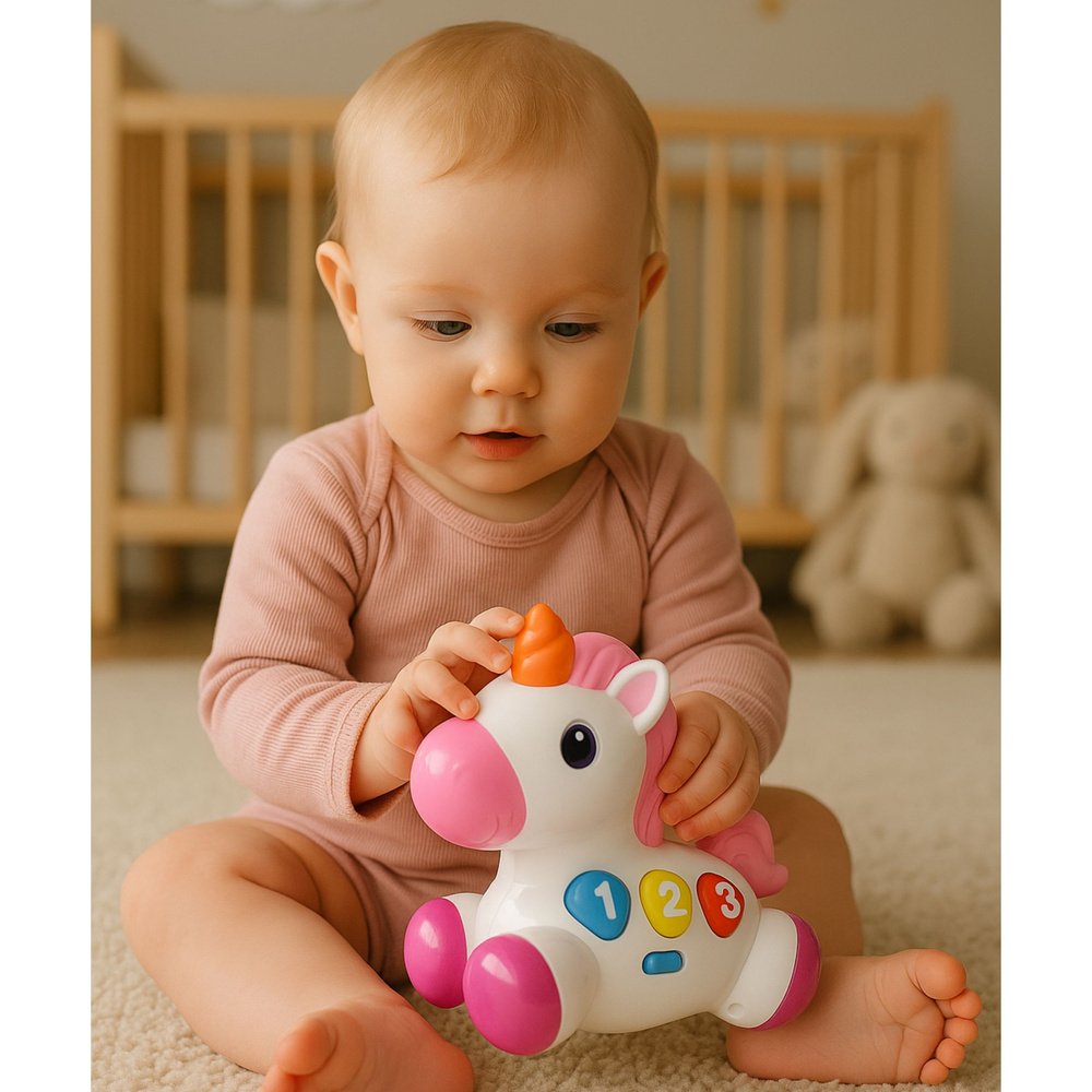 Šis interaktyvus vienaragis – spalvingas, linksmas ir mažyliams itin patrauklus žaislas, skatinantis judėjimą, tyrinėjimą ir pirmuosius mokymosi žingsnius. Paspaudus šoniniuose žaislo paviršiuose esančius 1, 2 ir 3 mygtukus, vienaragis groja skirtingas melodijas, leidžia garsus ir šviečia, taip įtraukdamas vaiką į aktyvų žaidimą.