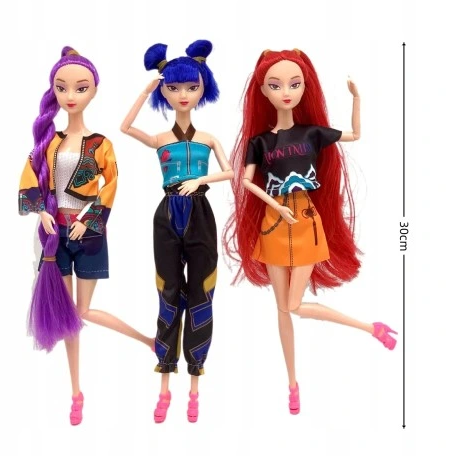 Kolekcinis „K‑Pop: Demon Hunter“ trijų mados lėlių rinkinys sujungia korėjietišką muzikos estetiką ir fantastišką demonų pasaulį. Lėlės turi lanksčius sąnarius, yra pagamintos iš patvaraus PVC, 30 cm aukščio – puikiai tinka žaidimui, pozavimui ir ekspozicijai. Modernus dizainas ir unikali tema daro šį rinkinį išskirtine dovana K‑Pop ir kūrybiško žaidimo gerbėjams.