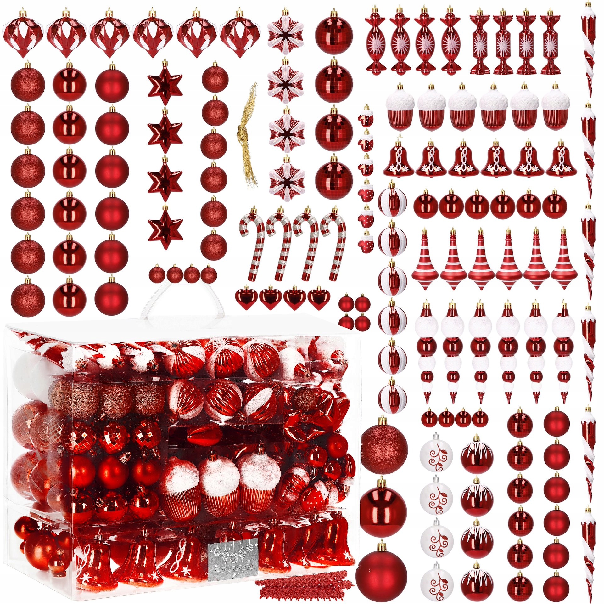 Didelis Kalėdinių eglučių kamuoliukų rinkinys, 153 vnt., XXL raudoni
