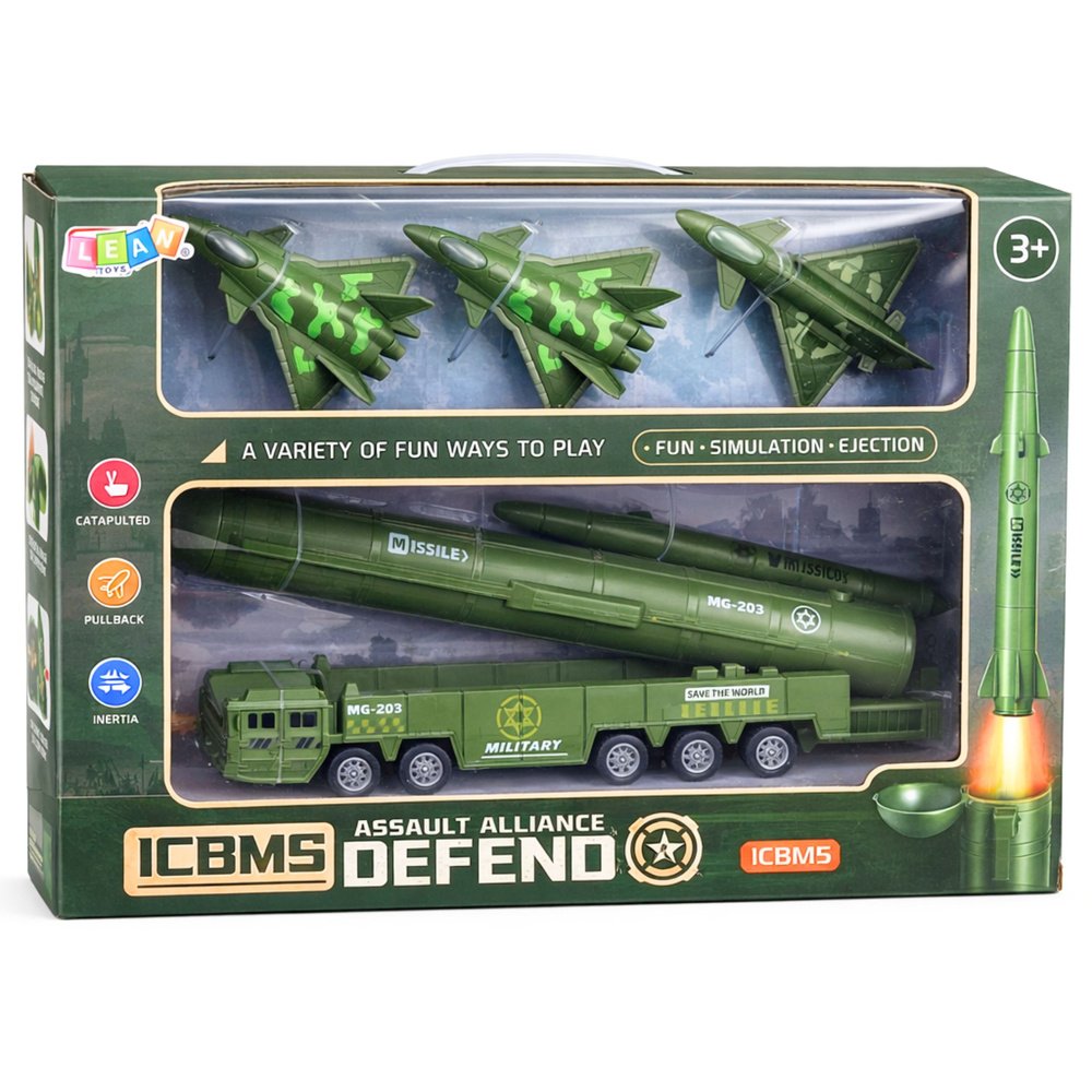 🚛✈️ Karinis rinkinys: raketų paleidimo sunkvežimis ir naikintuvai su atbuline trauka