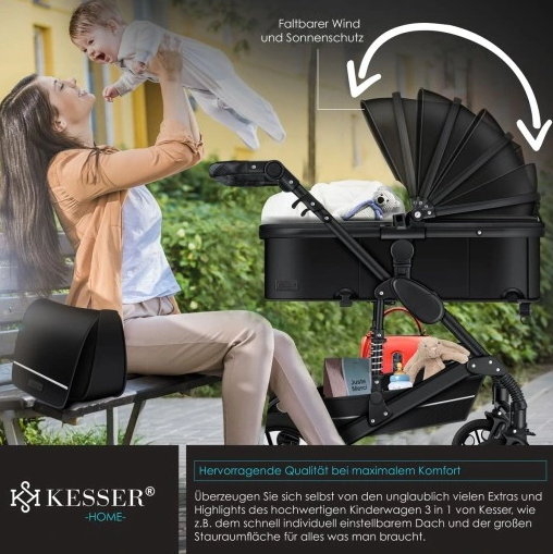 KESSER Loops 3 viename vežimėlis su plačiu priedų asortimentu užtikrina tobulą mobilumą nuo gimimo.