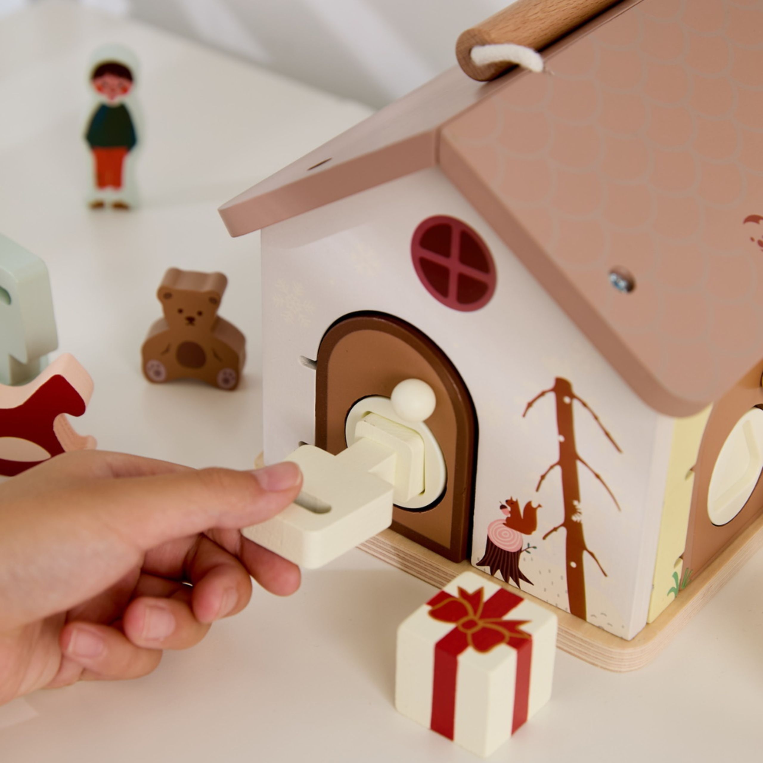 KLASIKINIS PASAULIS Medinis mokomasis sensorinis namas su raktų spynomis 11vnt