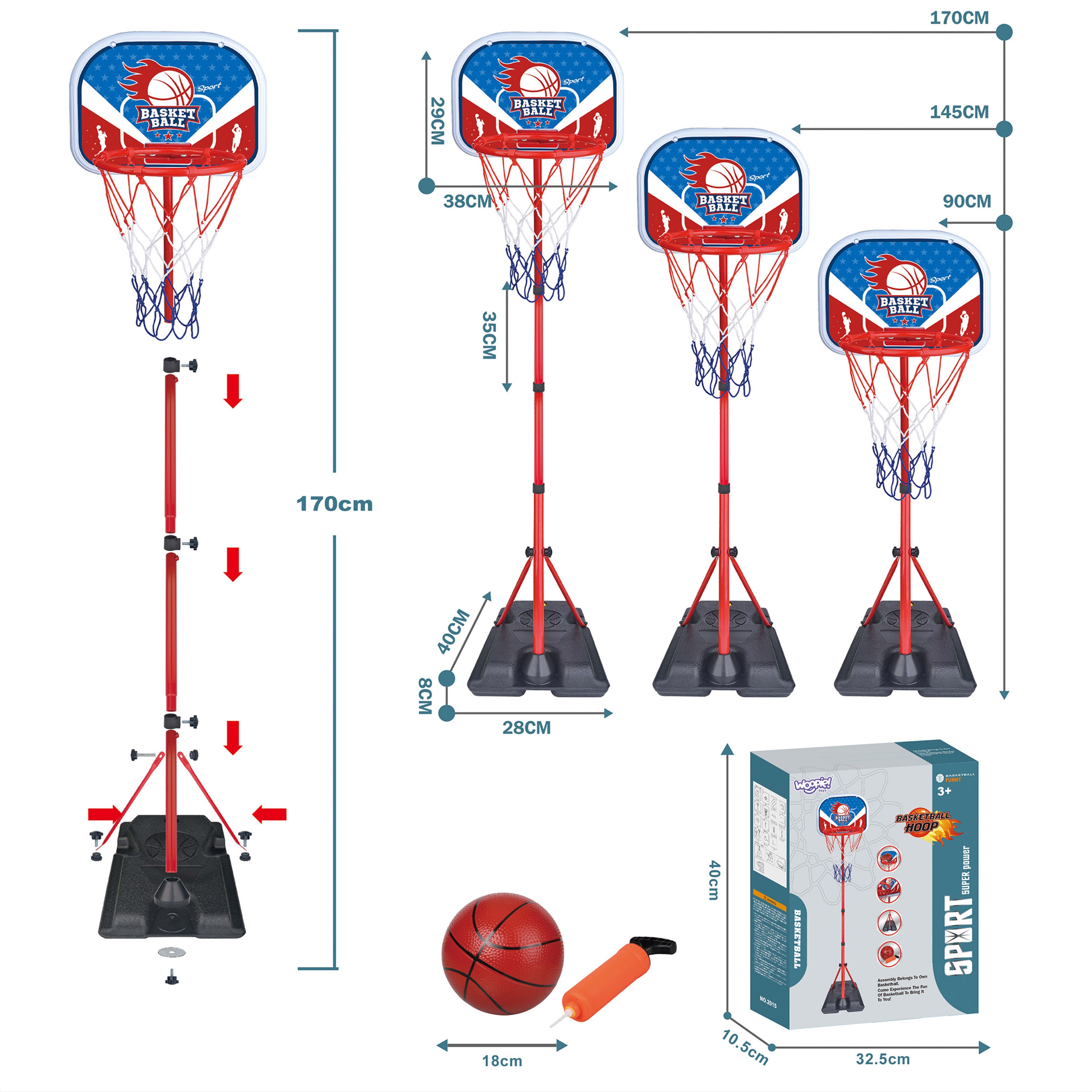 – Krepšinis turi 3 aukščio reguliavimus: 90, 145 ir 170 cm