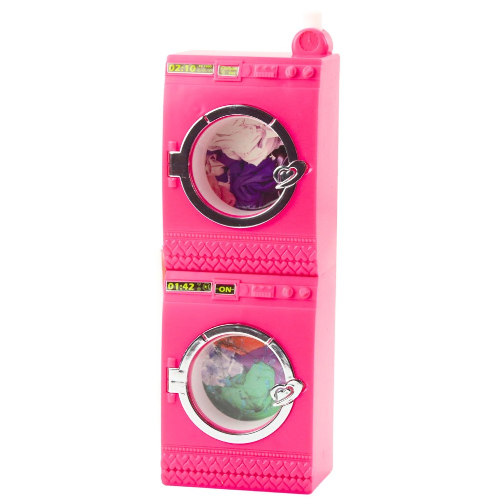Rinkinio centre – skalbimo mašina su besisukančiu būgnu, kuris pradeda suktis vieno mygtuko paspaudimu. Viršuje įrengta džiovyklė, o šalia – modernus drabužių kabinimo stovas ir skalbinių krepšys, suteikiantys dar daugiau žaidimo galimybių. Komplekte taip pat yra skalbiklio imitacijos ir pakabų rinkinys, padedantis tvarkingai sutvarkyti lėlės garderobą.